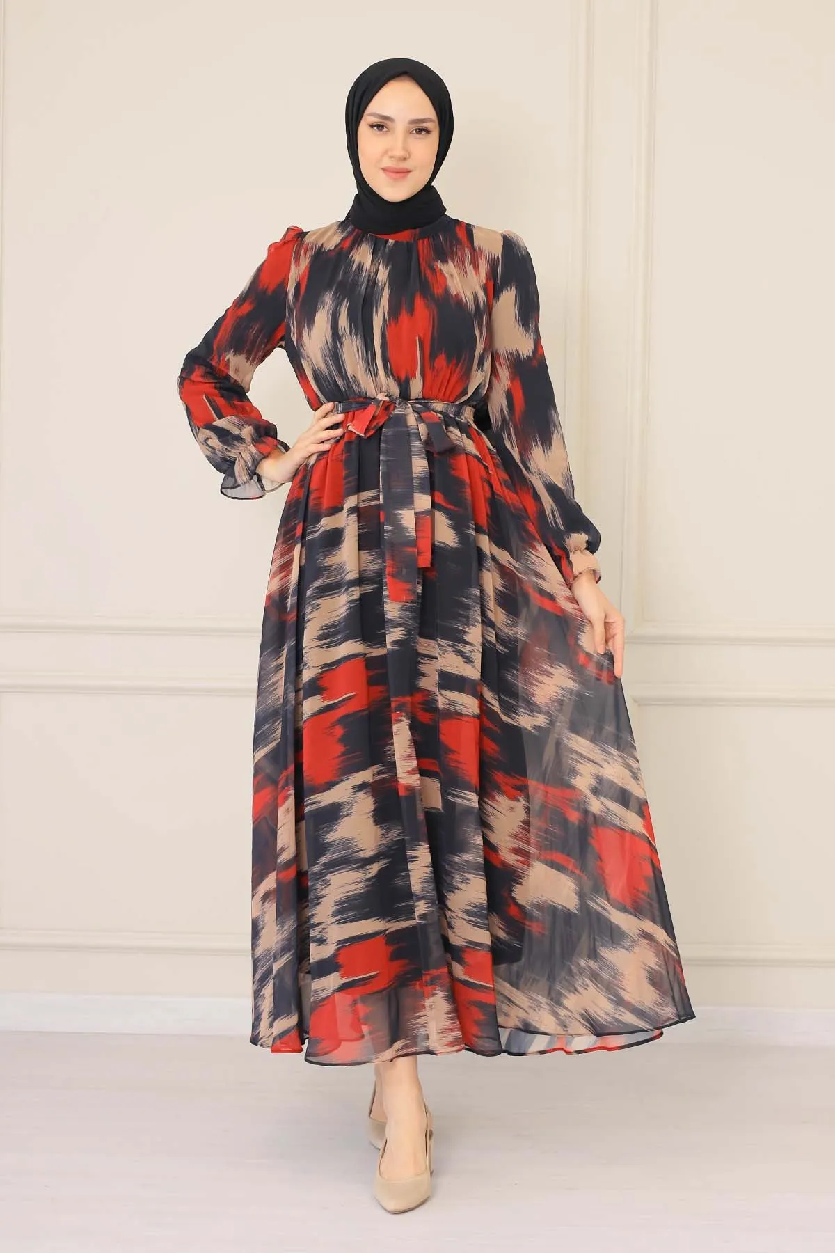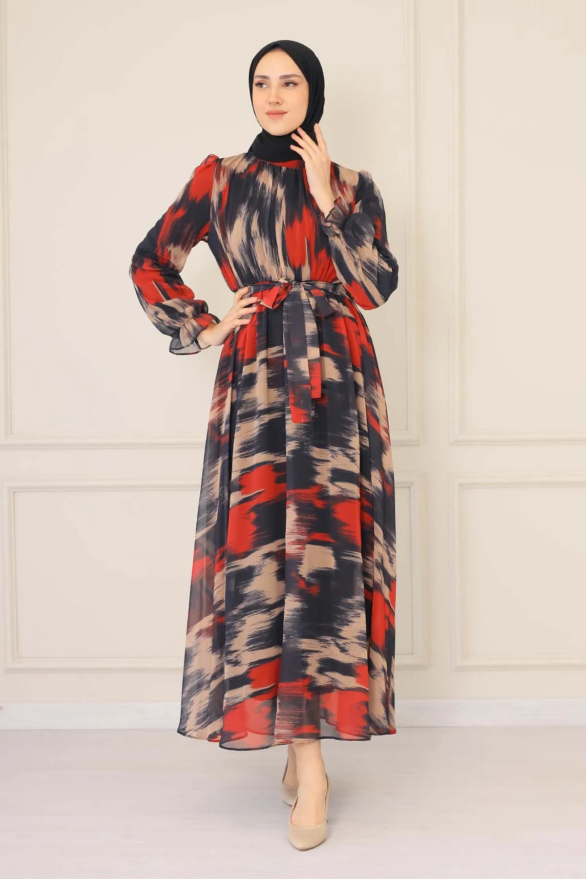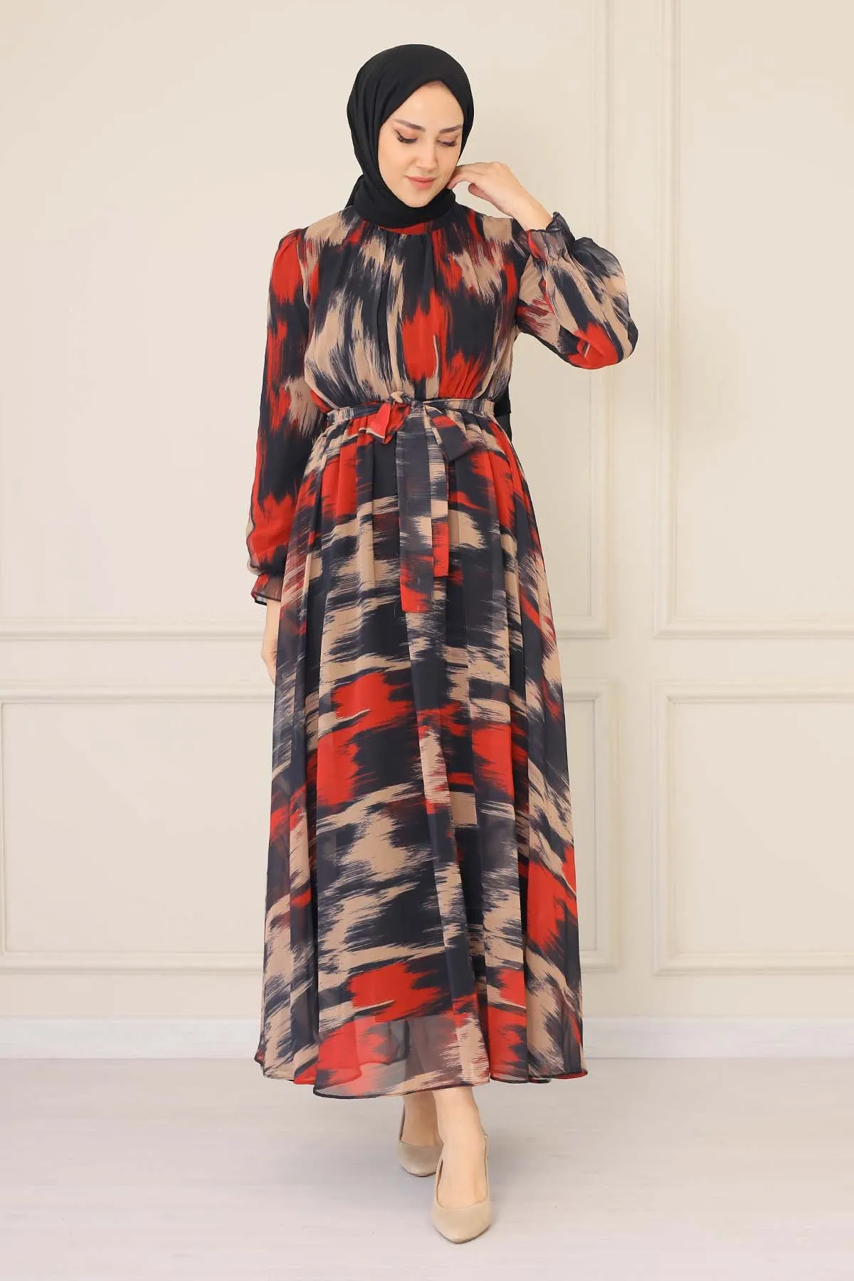 DescriptionReviews Description Made of chiffon (100% polyester) which is a fabric that can be used in all seasons.Round collar (padded).It has a zipper that can be used from the back.The belt is included with the product and may not be used optionally.Product length 150 cmThere may be a difference in product color due to shots.Washing: It can be washed at 30 degreesModel dimensions: Height: 175 cm, Chest: 82 cm, Waist: 68 cm, Hips: 96 cm, Weight: 53 kg.(The product is in model size 38)Dress sizes: 38 - 50 - 52 Reviews Be the first to review this item There are no reviews yet