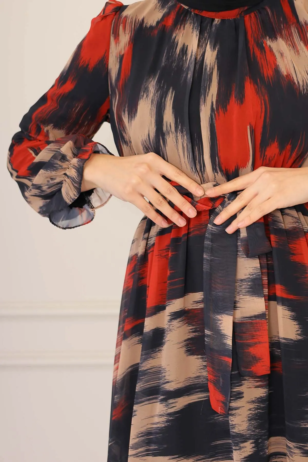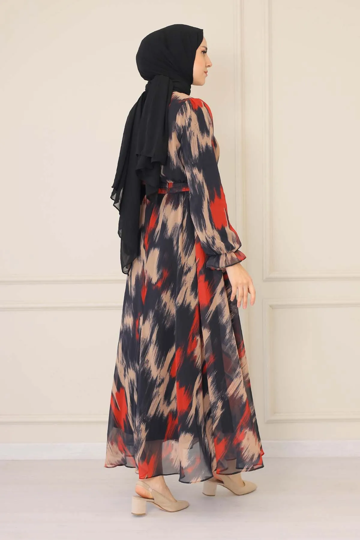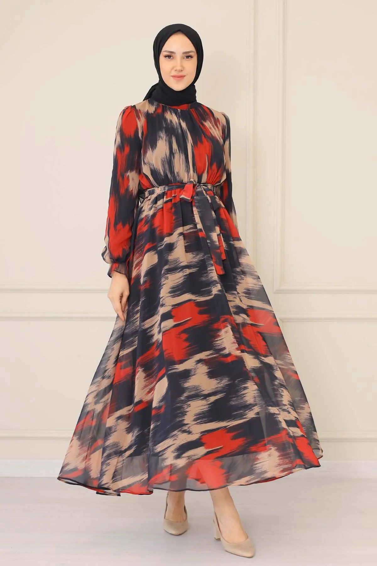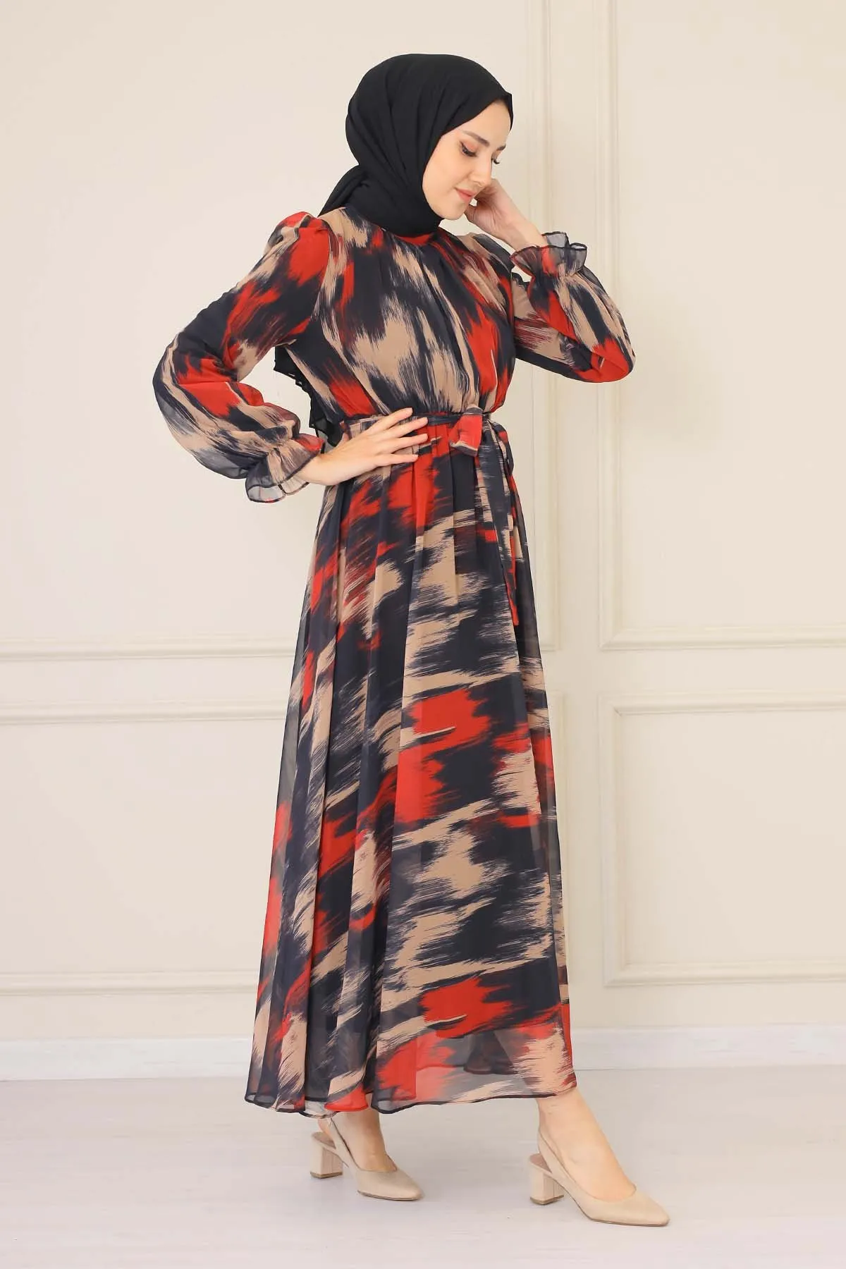 DescriptionReviews Description Made of chiffon (100% polyester) which is a fabric that can be used in all seasons.Round collar (padded).It has a zipper that can be used from the back.The belt is included with the product and may not be used optionally.Product length 150 cmThere may be a difference in product color due to shots.Washing: It can be washed at 30 degreesModel dimensions: Height: 175 cm, Chest: 82 cm, Waist: 68 cm, Hips: 96 cm, Weight: 53 kg.(The product is in model size 38)Dress sizes: 38 - 50 - 52 Reviews Be the first to review this item There are no reviews yet