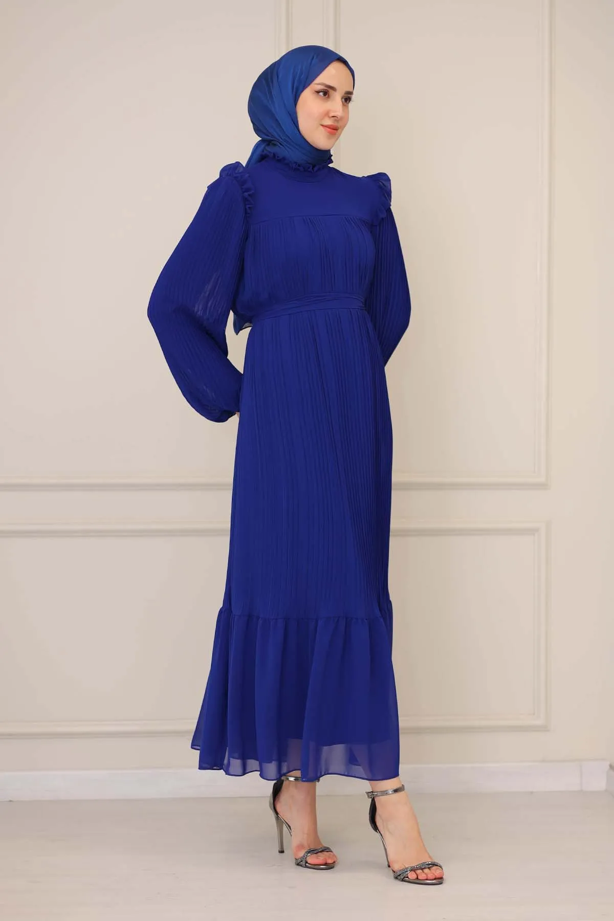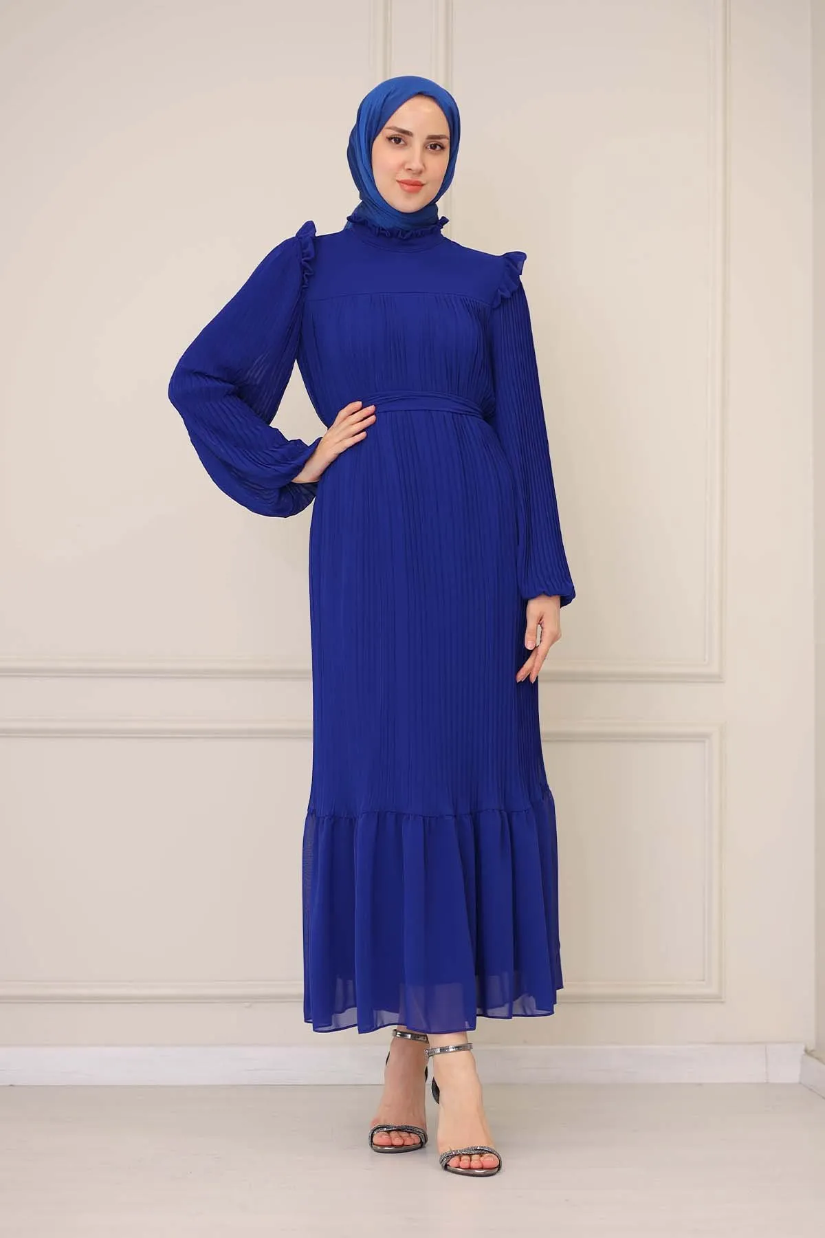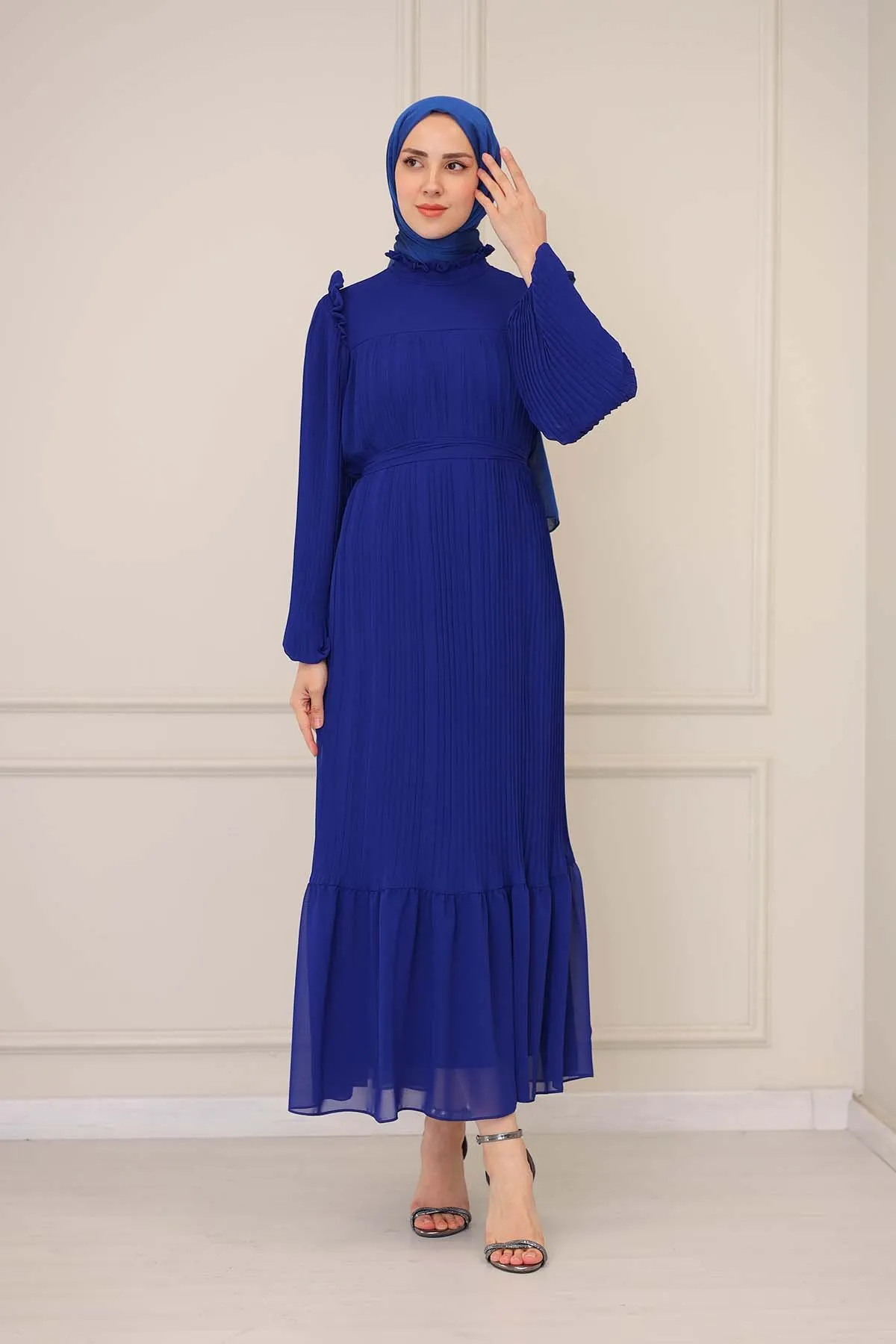 DescriptionReviews Description Pleated dress for veiled women with ruffle detailsMade of chiffon fabric. It is a fabric that can be used in all four seasons.The product is lined.There is a zipper on the back.The belt is included with the product and may not be used optionally.Product length 160 cmModel Dimensions:Height: 170 cmChest: 82 cmWaist: 68 cmHips: 96 cmWeight: 55 (product in model size 38)Dress Size: 38 Reviews Be the first to review this item There are no reviews yet
