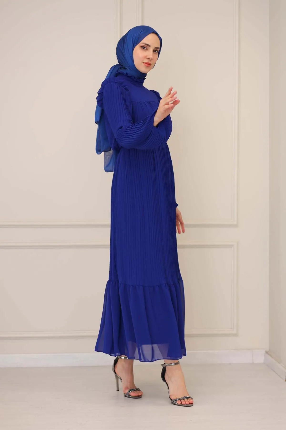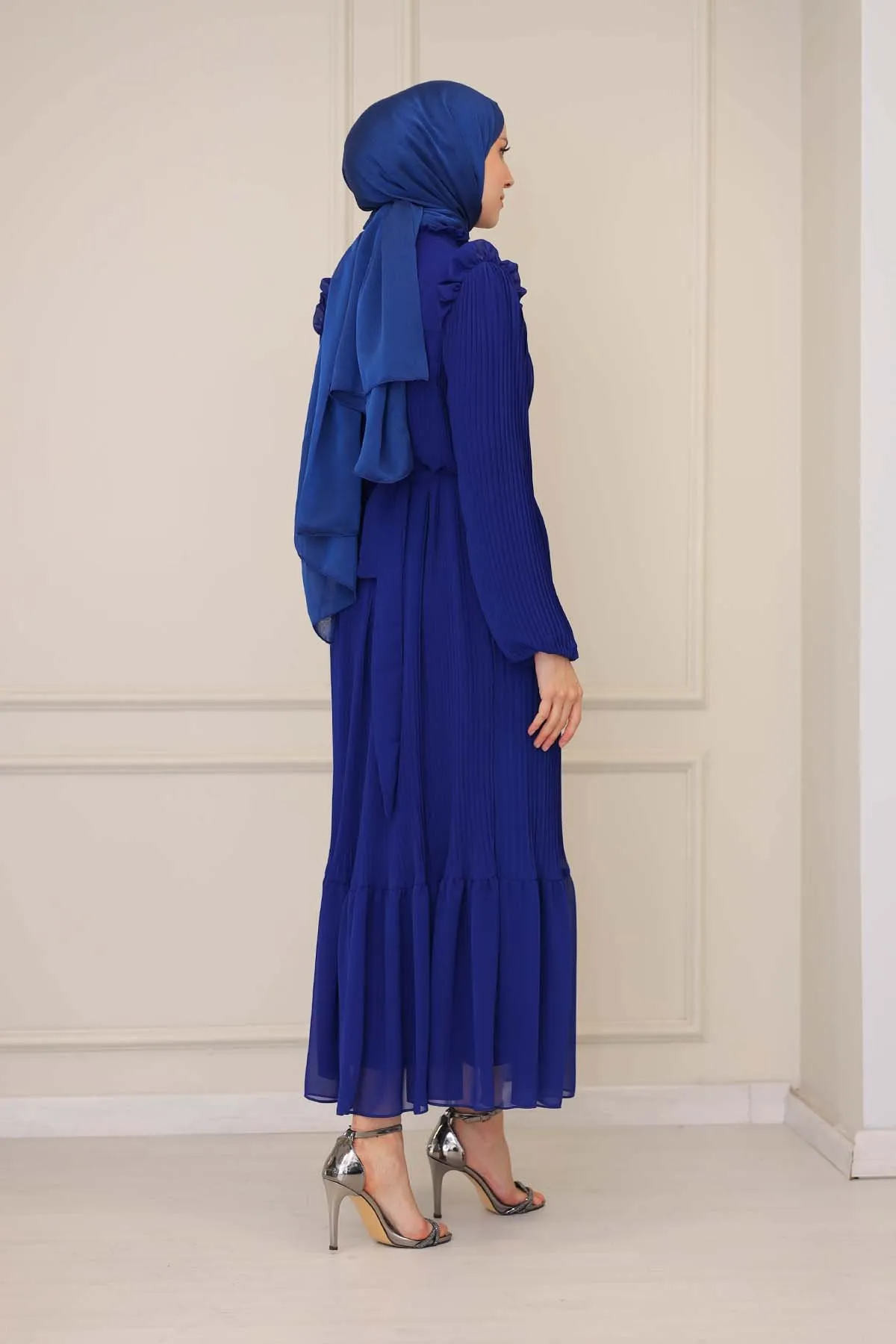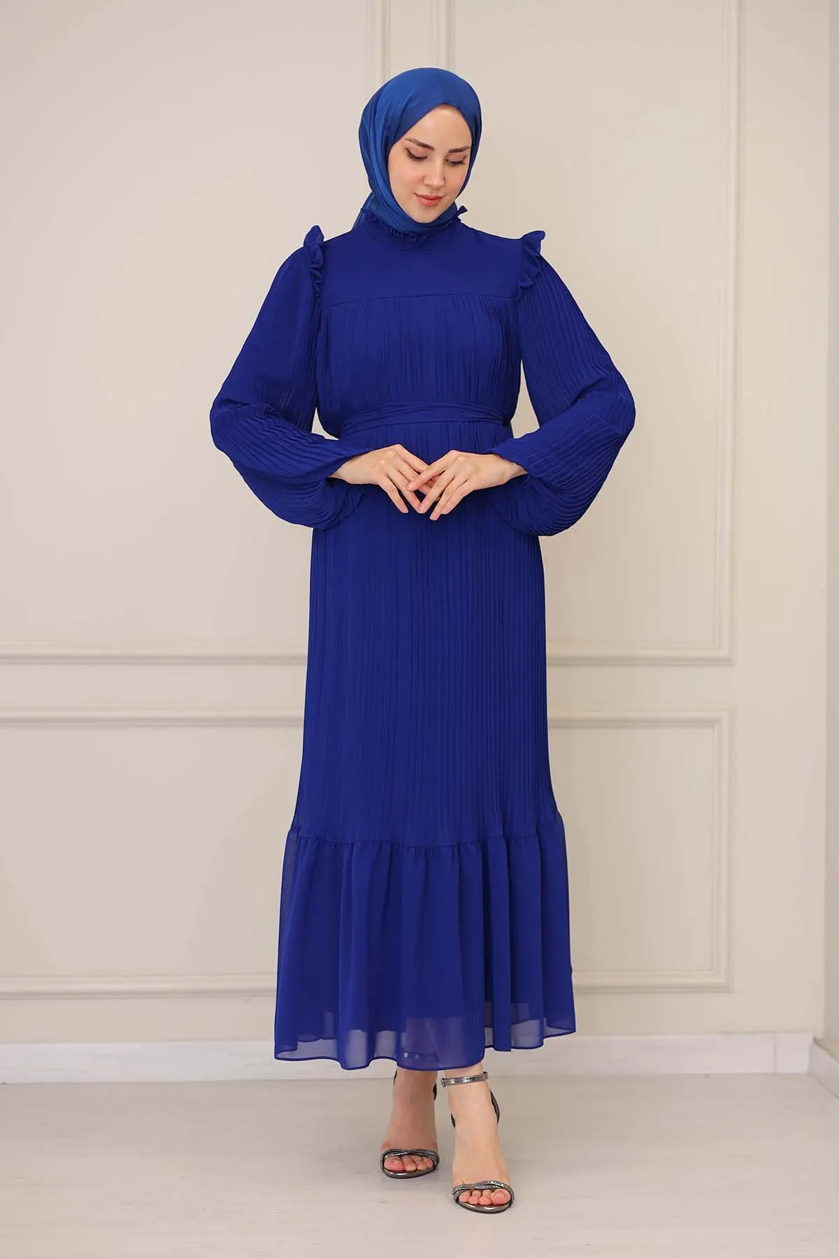 DescriptionReviews Description Pleated dress for veiled women with ruffle detailsMade of chiffon fabric. It is a fabric that can be used in all four seasons.The product is lined.There is a zipper on the back.The belt is included with the product and may not be used optionally.Product length 160 cmModel Dimensions:Height: 170 cmChest: 82 cmWaist: 68 cmHips: 96 cmWeight: 55 (product in model size 38)Dress Size: 38 Reviews Be the first to review this item There are no reviews yet