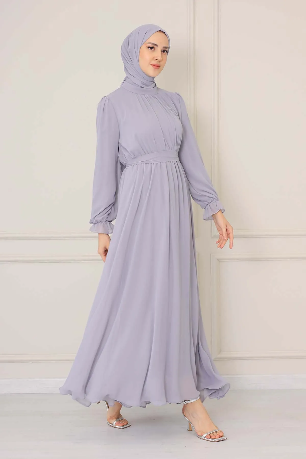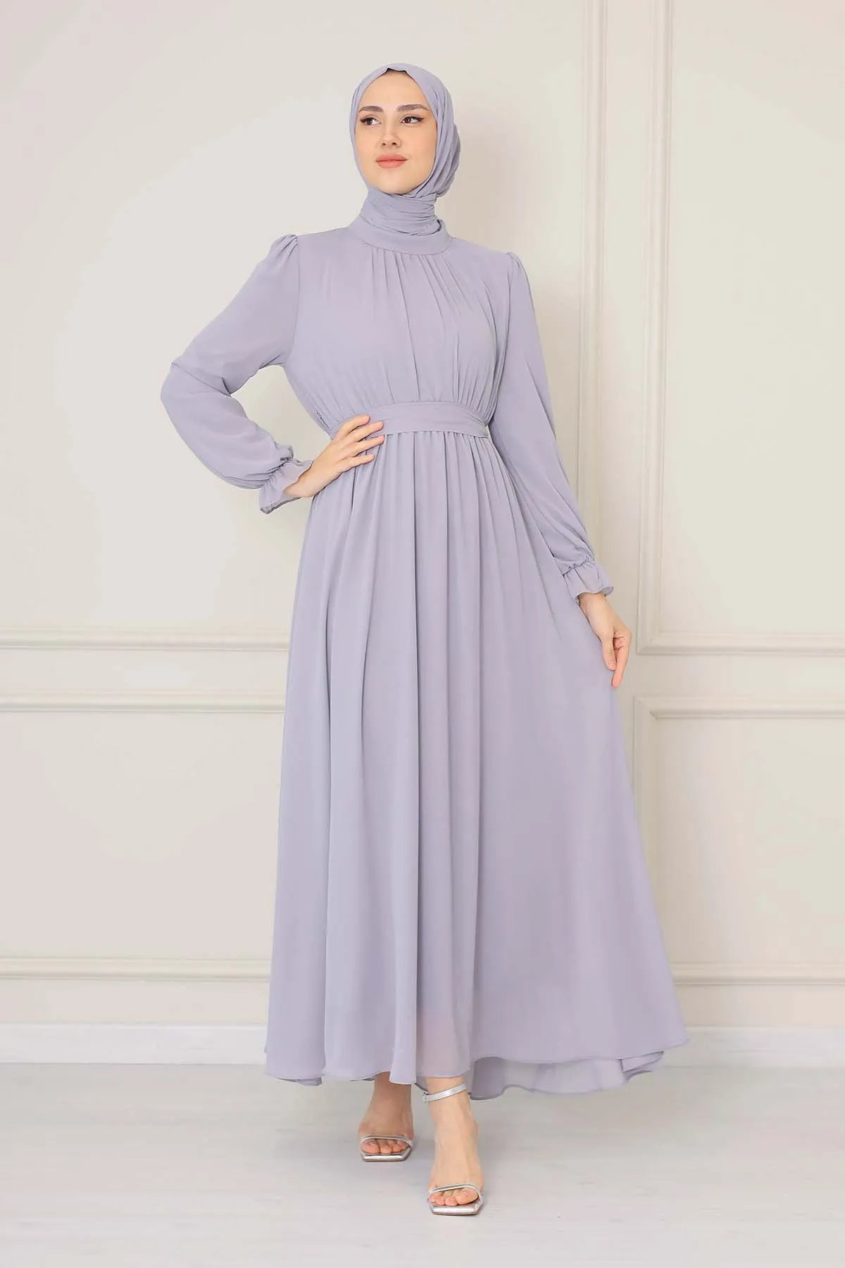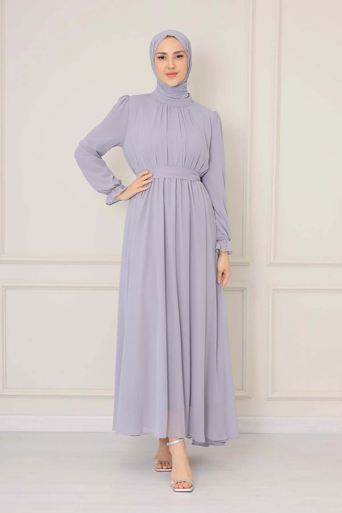 DescriptionReviews Description Made of chiffon fabric. It is a fabric that can be used in all four seasons.The product is lined.There is a zipper on the back.There are gathered details on the sleeves.The belt is included in the product.Product length 150 cmModel Dimensions:Height: 170 cmChest: 82 cmWaist: 68 cmHips: 96 cmWeight: 55 (product in model size 38)Dress Size: 38 Reviews Be the first to review this item There are no reviews yet