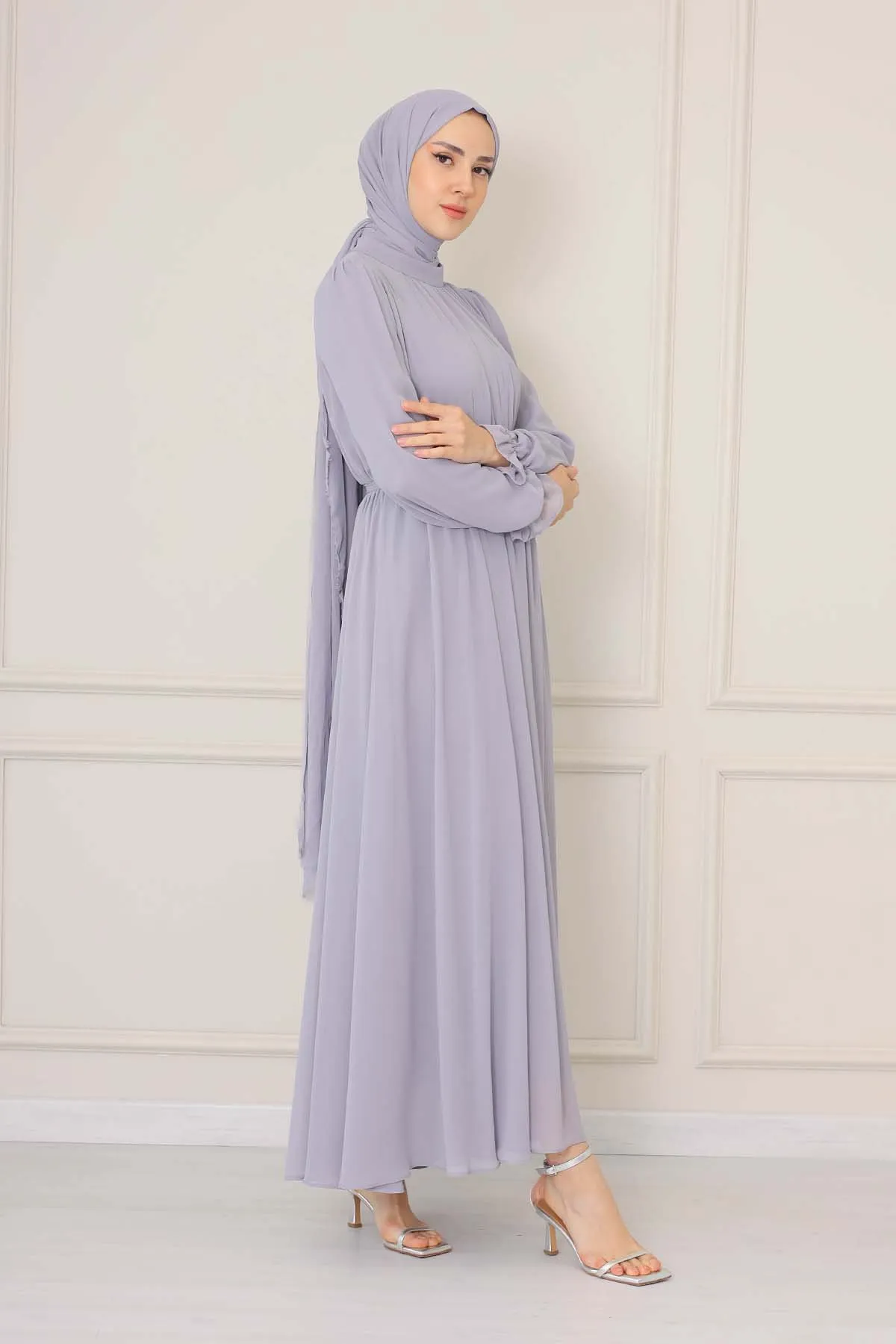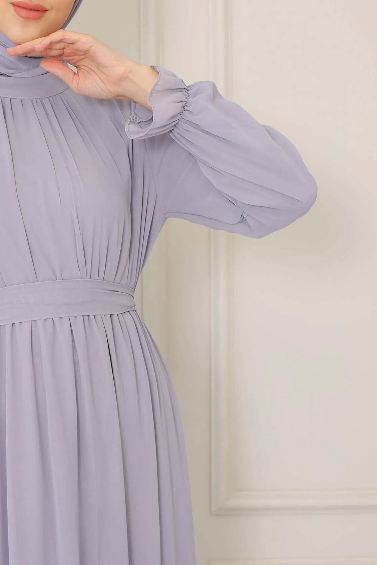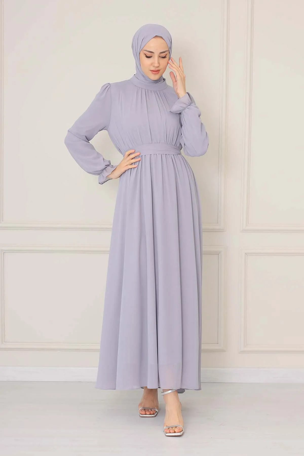 DescriptionReviews Description Made of chiffon fabric. It is a fabric that can be used in all four seasons.The product is lined.There is a zipper on the back.There are gathered details on the sleeves.The belt is included in the product.Product length 150 cmModel Dimensions:Height: 170 cmChest: 82 cmWaist: 68 cmHips: 96 cmWeight: 55 (product in model size 38)Dress Size: 38 Reviews Be the first to review this item There are no reviews yet