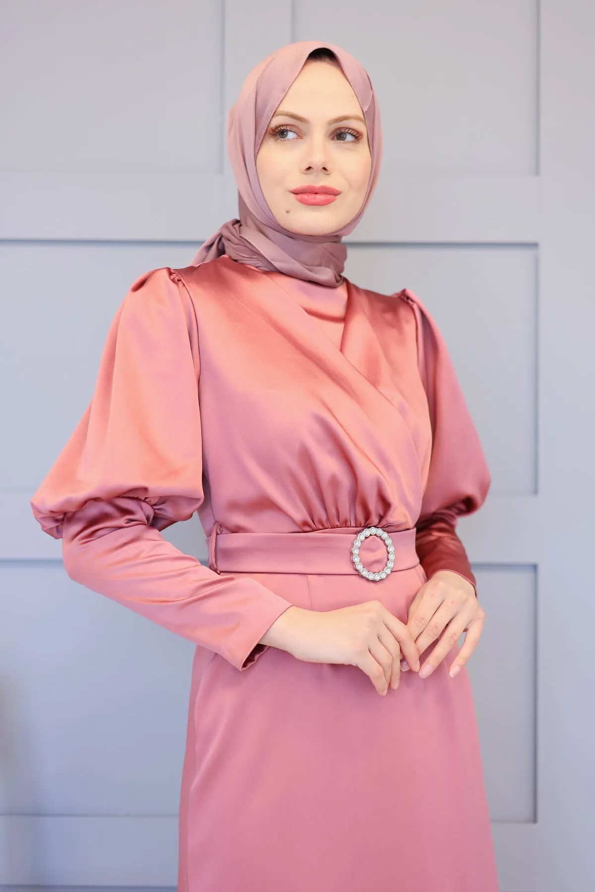DescriptionReviews Description Satin evening dress with pink satin beltMade of satin fabric, it can be used in all seasons.It is not lined. It does not appear through it.It has a round neck, and has a zipper that can be used at the back.There is no stretch in the fabric.Product runs one size smaller.There may be a difference in product color due to shots.Washing: Dry clean onlyModel dimensions: Height: 170 cm, Chest: 82 cm, Waist: 68 cm, Hips: 84 cm, Weight: 54 kg.(The product is in model size 38)Dress Size: 40 Reviews Be the first to review this item There are no reviews yet