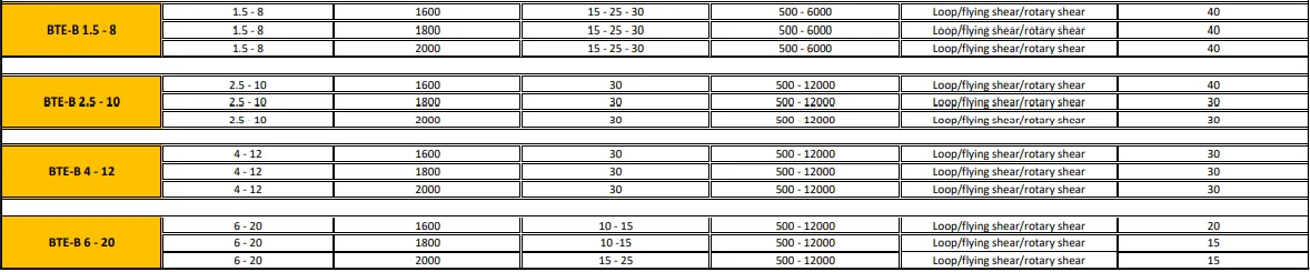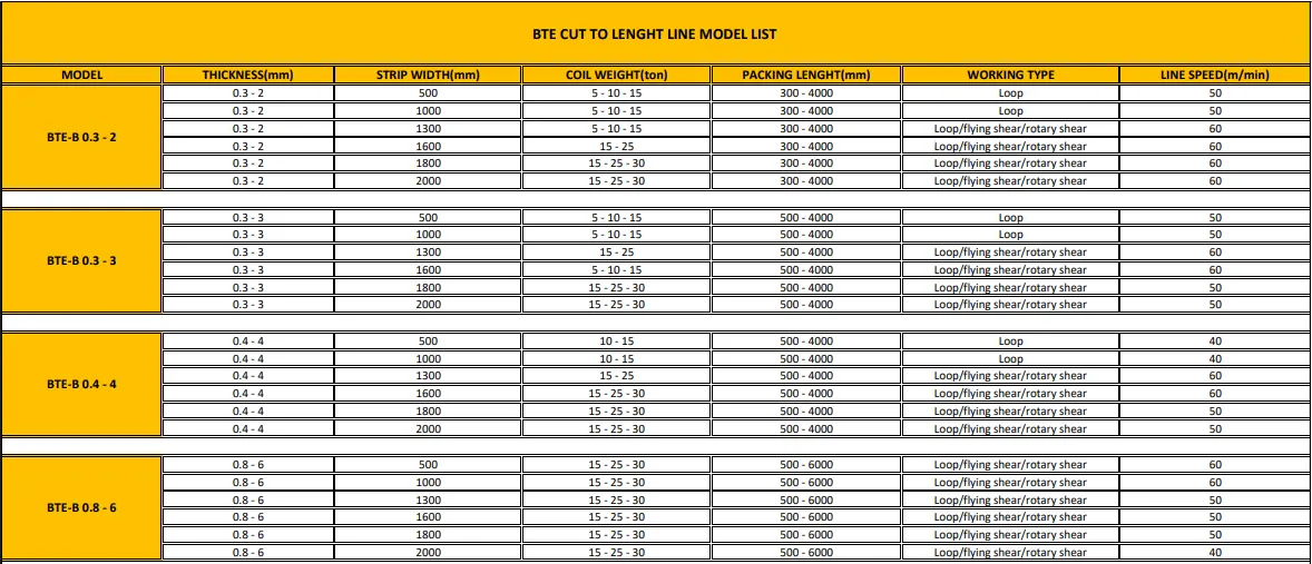 يتم إنتاج خطوط القطع حسب الطول بسمك يتراوح من 0.20 مم على الأقل إلى 25 مم كحد أقصى، ومن عرض 300 مم على الأقل إلى عرض 2500 مم كحد أقصى.