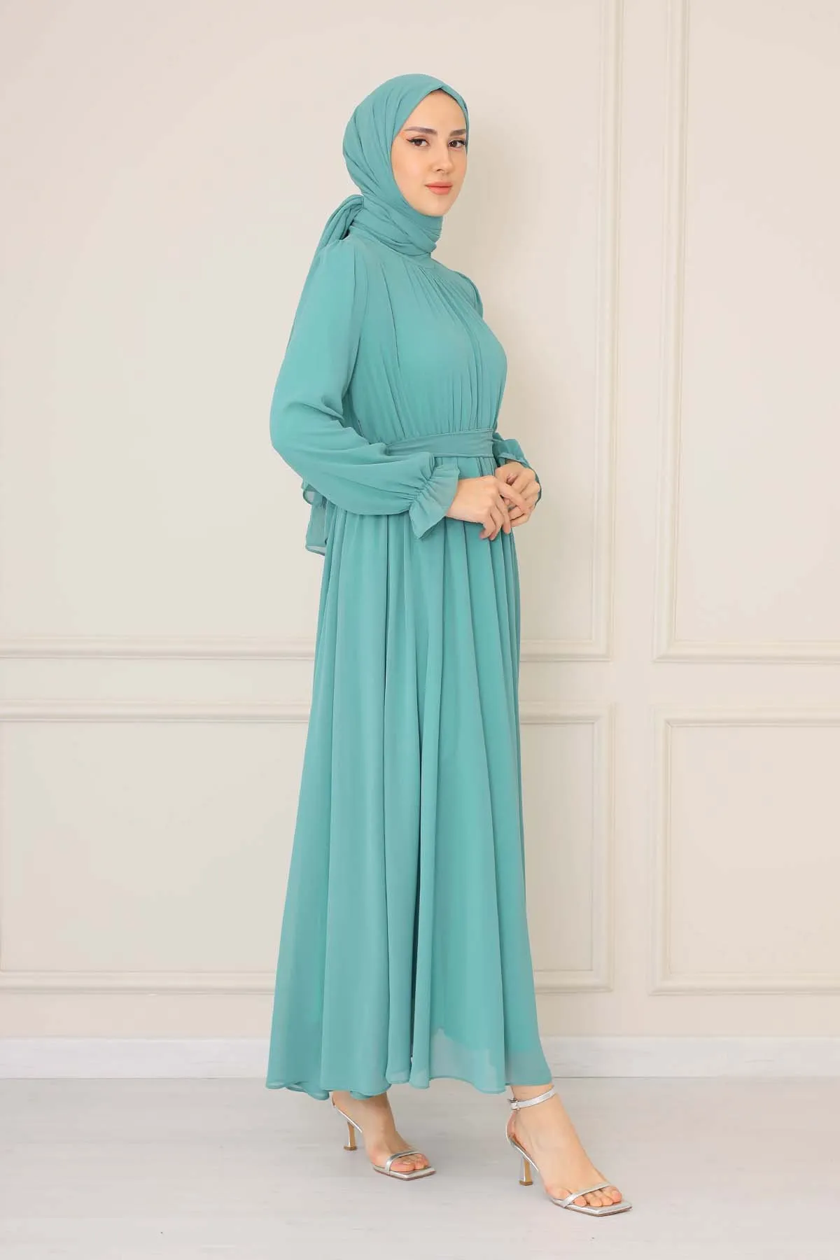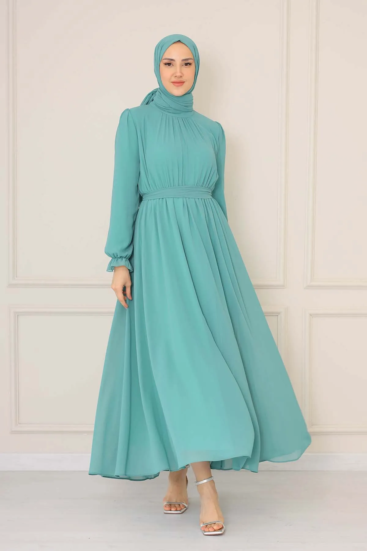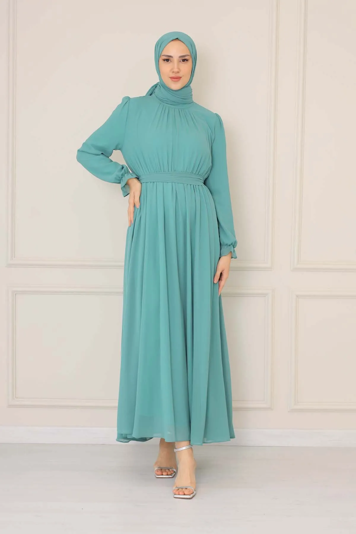 DescriptionReviews Description Made of chiffon fabric. It is a fabric that can be used in all four seasons.The product is lined.There is a zipper on the back.There are gathered details on the sleeves.The belt is included in the product.Product length 150 cmModel Dimensions:Height: 170 cmChest: 82 cmWaist: 68 cmHips: 96 cmWeight: 55 (product in model size 38)Dress sizes: 36 - 38 - 42 Reviews Be the first to review this item There are no reviews yet