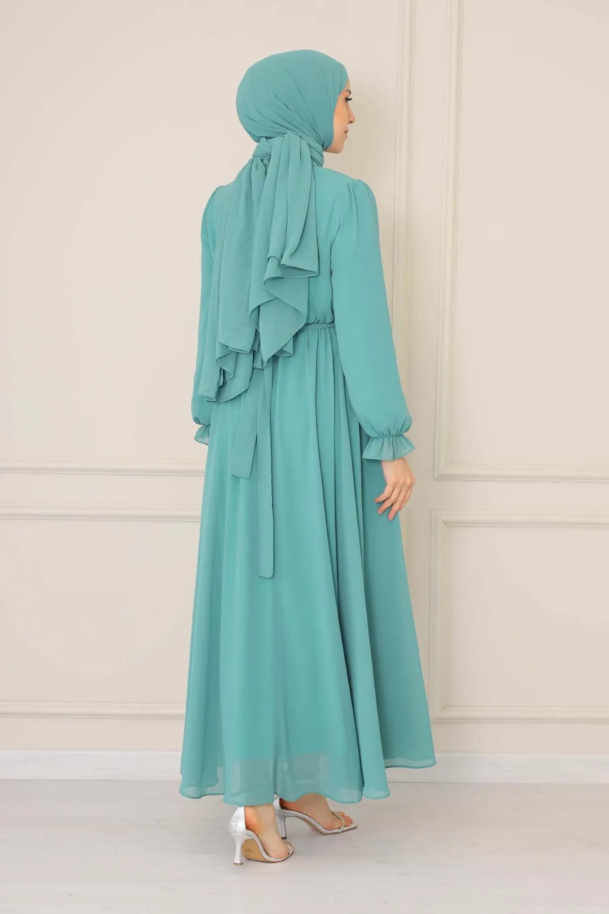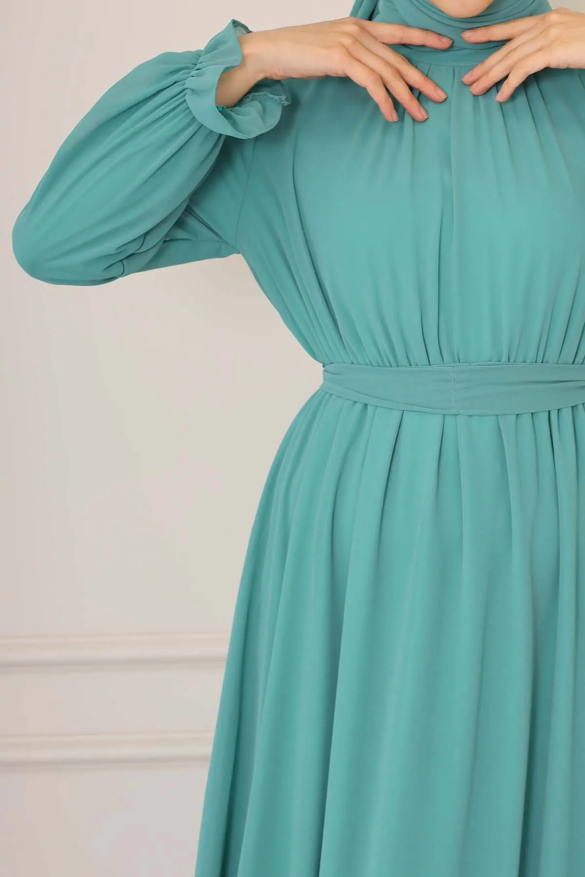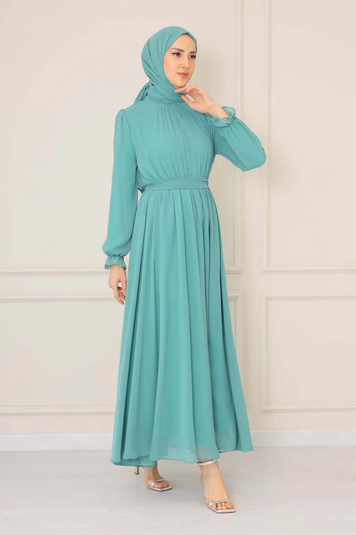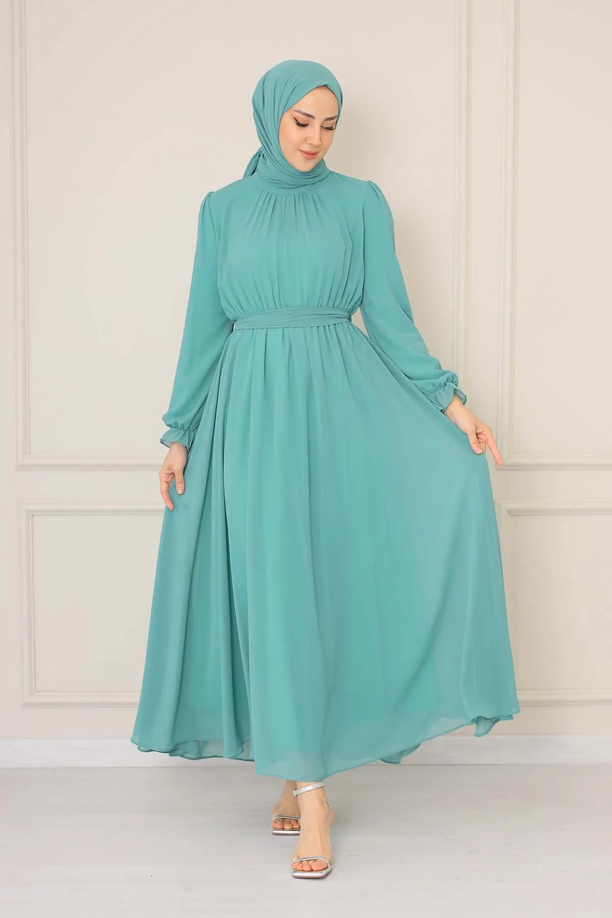 DescriptionReviews Description Made of chiffon fabric. It is a fabric that can be used in all four seasons.The product is lined.There is a zipper on the back.There are gathered details on the sleeves.The belt is included in the product.Product length 150 cmModel Dimensions:Height: 170 cmChest: 82 cmWaist: 68 cmHips: 96 cmWeight: 55 (product in model size 38)Dress sizes: 36 - 38 - 42 Reviews Be the first to review this item There are no reviews yet
