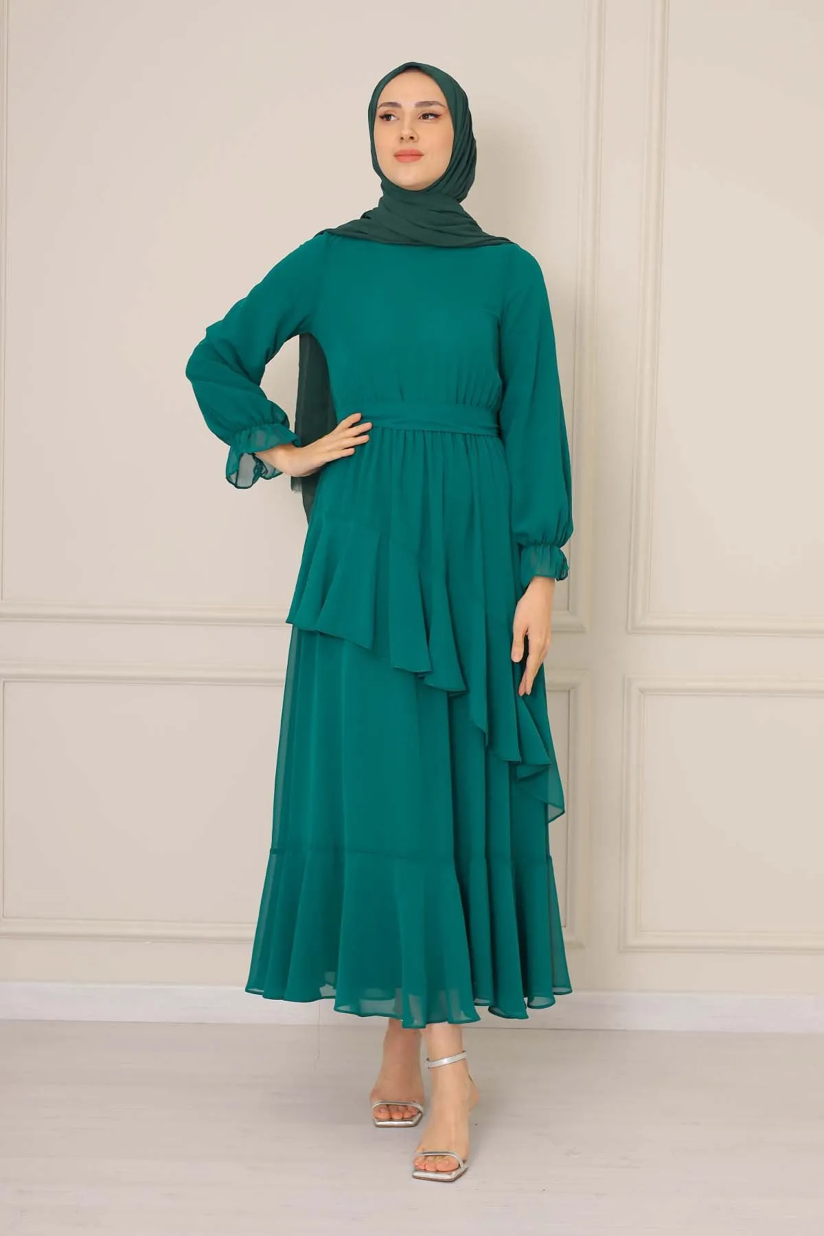 DescriptionReviews Description Chiffon dress with ruffle details at the front and sleevesMade of chiffon fabric. It is a fabric that can be used in all four seasons.The product is lined.The belt is included with the product and may not be used optionally.Product length 135 cmModel Dimensions:Height: 170 cmChest: 82 cmWaist: 68 cmHips: 96 cmWeight: 55 (product in model size 38)Dress Size: 36 Reviews Be the first to review this item There are no reviews yet