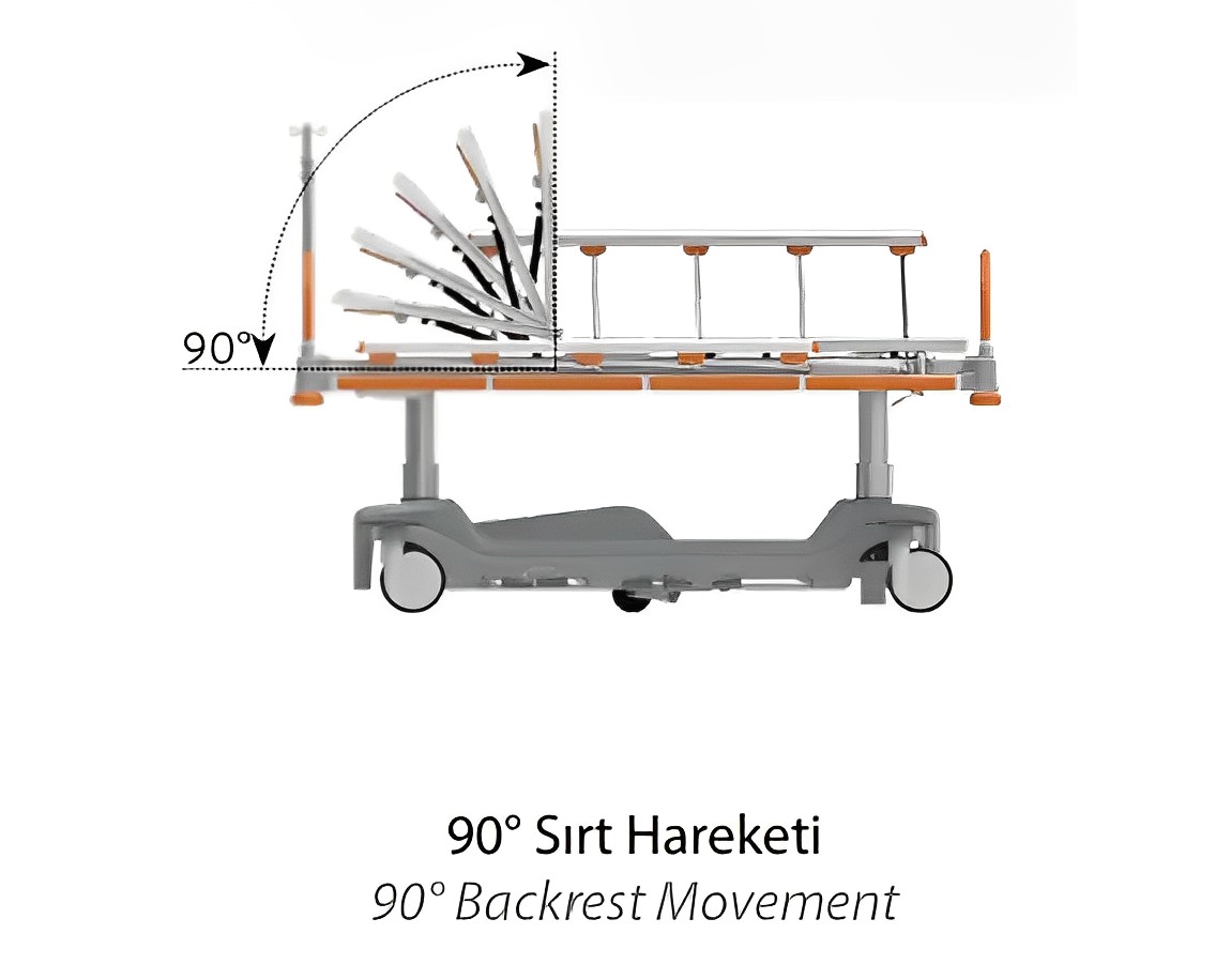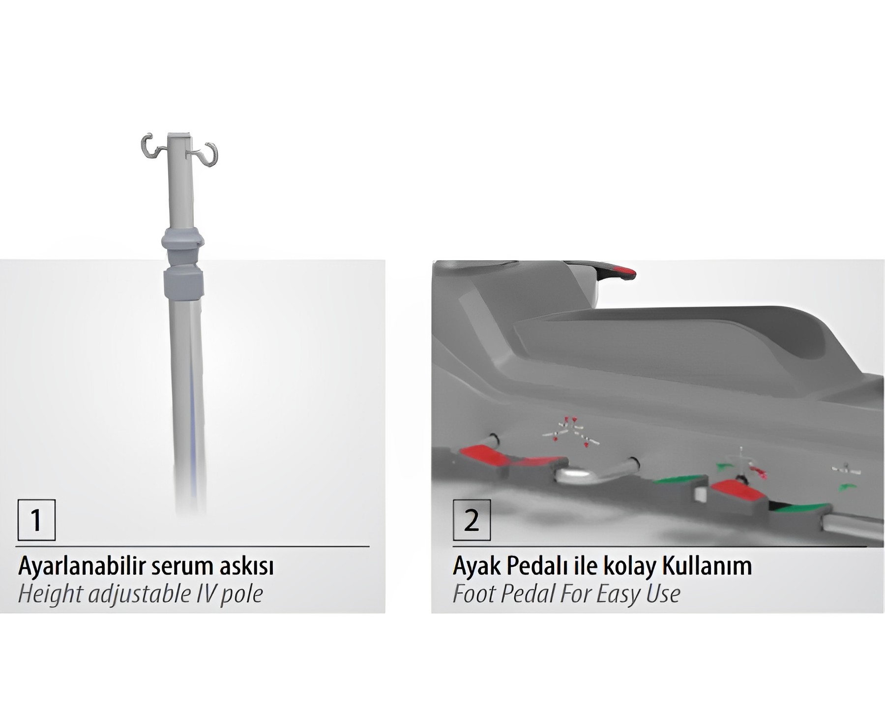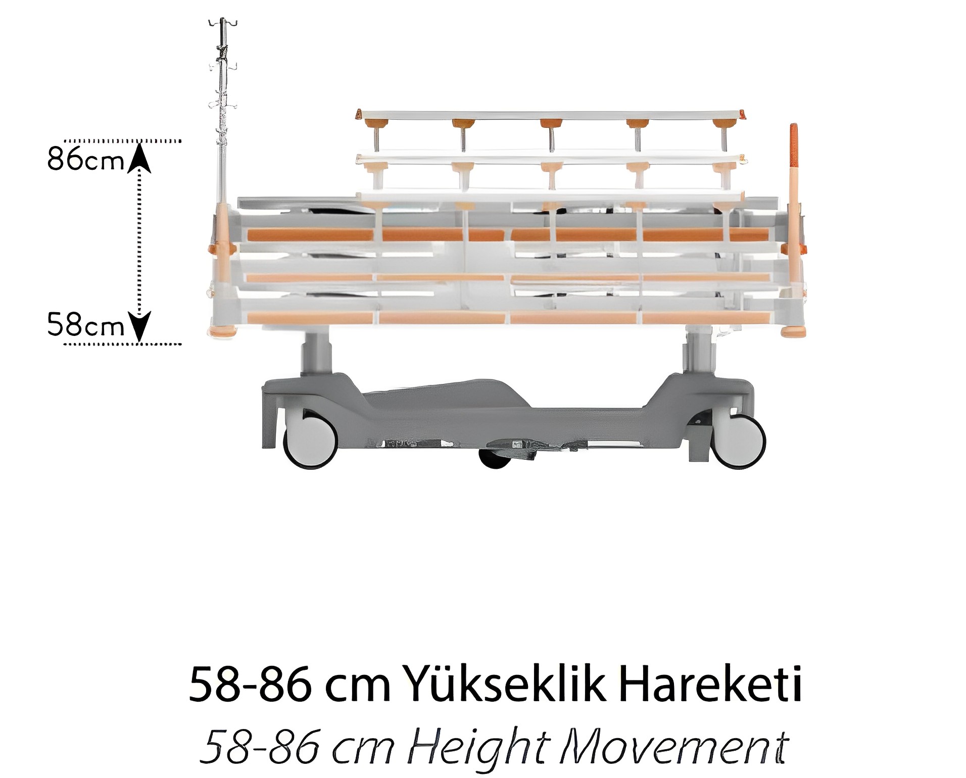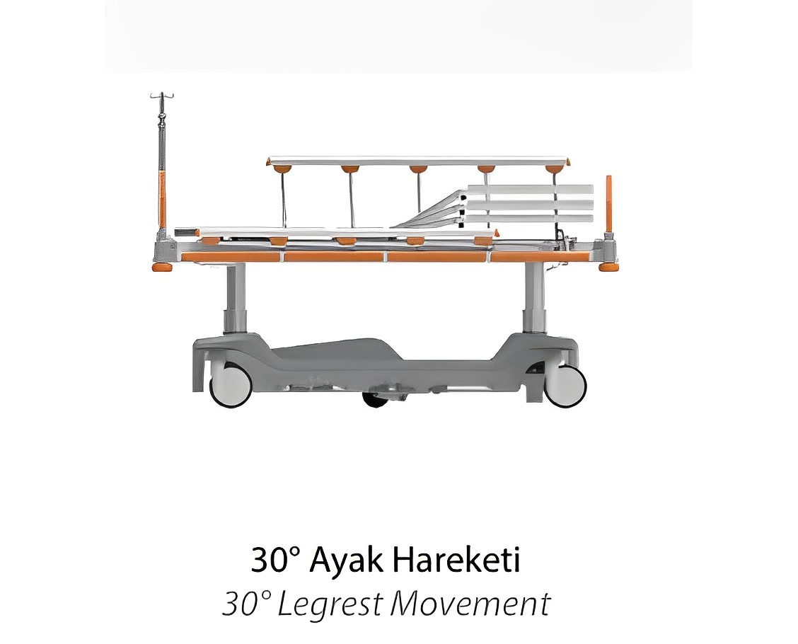 DescriptionReviews Description Nano ceramic electrostatic powder coating. Metal parts are coatedThe 4-piece reclining surface is made of compact materialSide barriers that can be opened and closed easilyCrash bumpers on all four cornersTelescopic folding IV polePlastic coated folding push bars360 degree swivel wheels with central braking system (200mm)Fifth wheel (enables the stretcher to be easily moved in the desired direction)Height is controlled hydraulically, and directional and reverse direction is adjusted using foot pedalsGas spring controlled back and foot adjustmentsAluminum telescopic polesABS plastic coated undercarriagePlace to hold the oxygen tubePatient restraint belt28 density mattresses (66 x 193 x 8 cm)X-ray tape holder Reviews Be the first to review this item There are no reviews yet