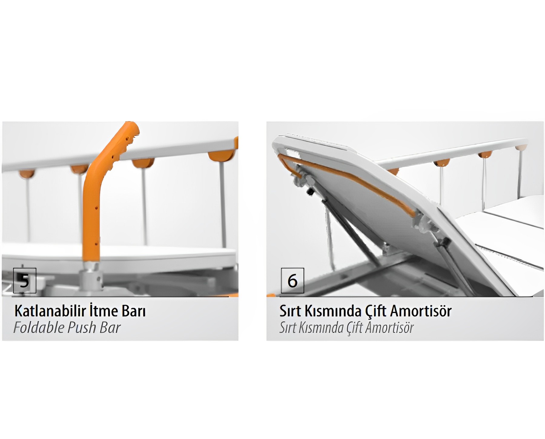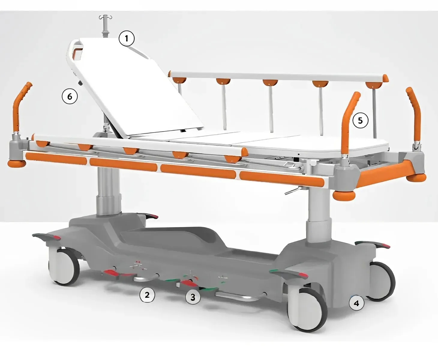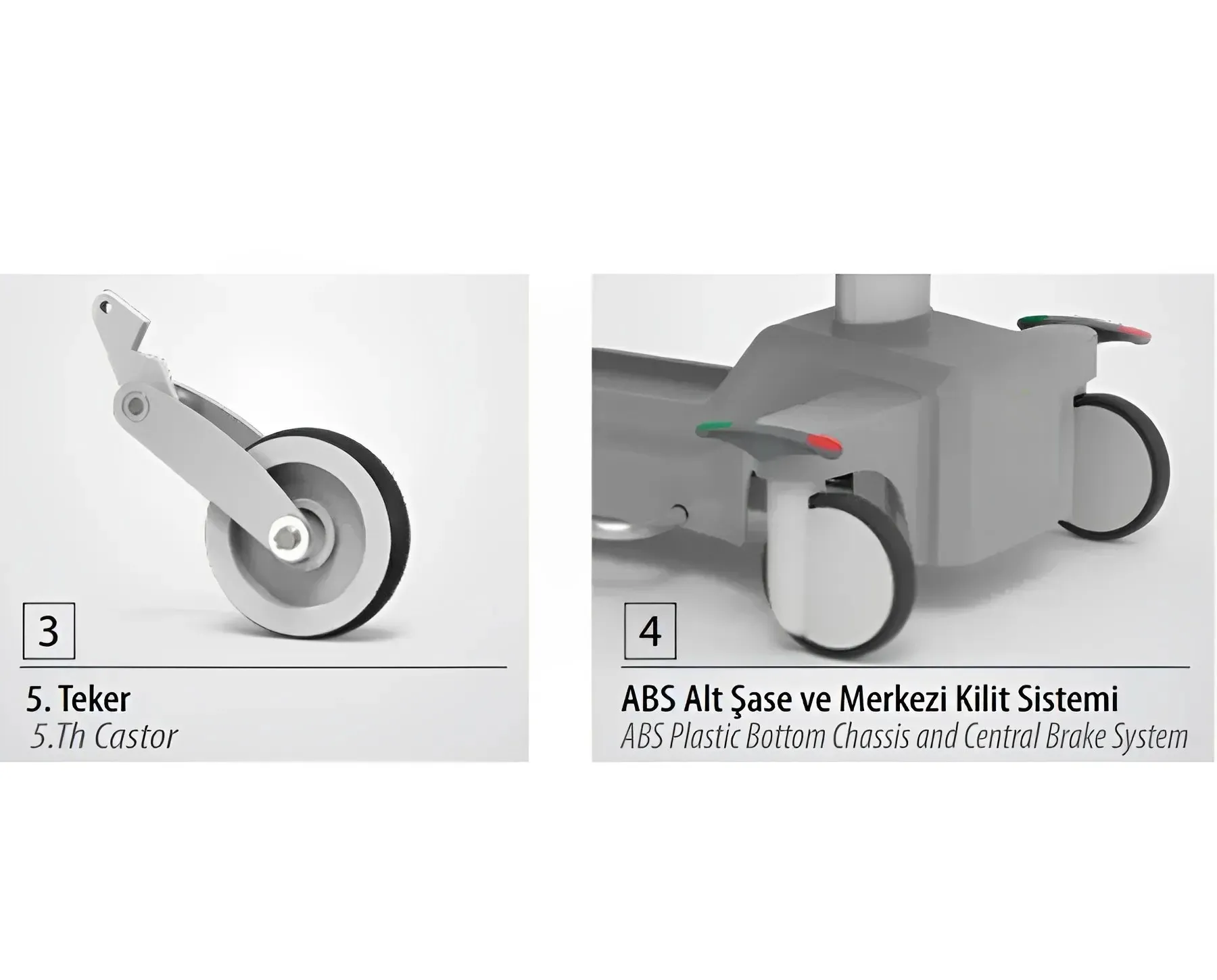 DescriptionReviews Description Nano ceramic electrostatic powder coating. Metal parts are coatedThe 4-piece reclining surface is made of compact materialSide barriers that can be opened and closed easilyCrash bumpers on all four cornersTelescopic folding IV polePlastic coated folding push bars360 degree swivel wheels with central braking system (200mm)Fifth wheel (enables the stretcher to be easily moved in the desired direction)Height is controlled hydraulically, and directional and reverse direction is adjusted using foot pedalsGas spring controlled back and foot adjustmentsAluminum telescopic polesABS plastic coated undercarriagePlace to hold the oxygen tubePatient restraint belt28 density mattresses (66 x 193 x 8 cm)X-ray tape holder Reviews Be the first to review this item There are no reviews yet