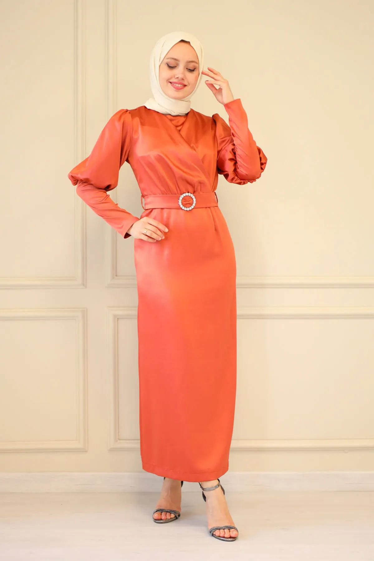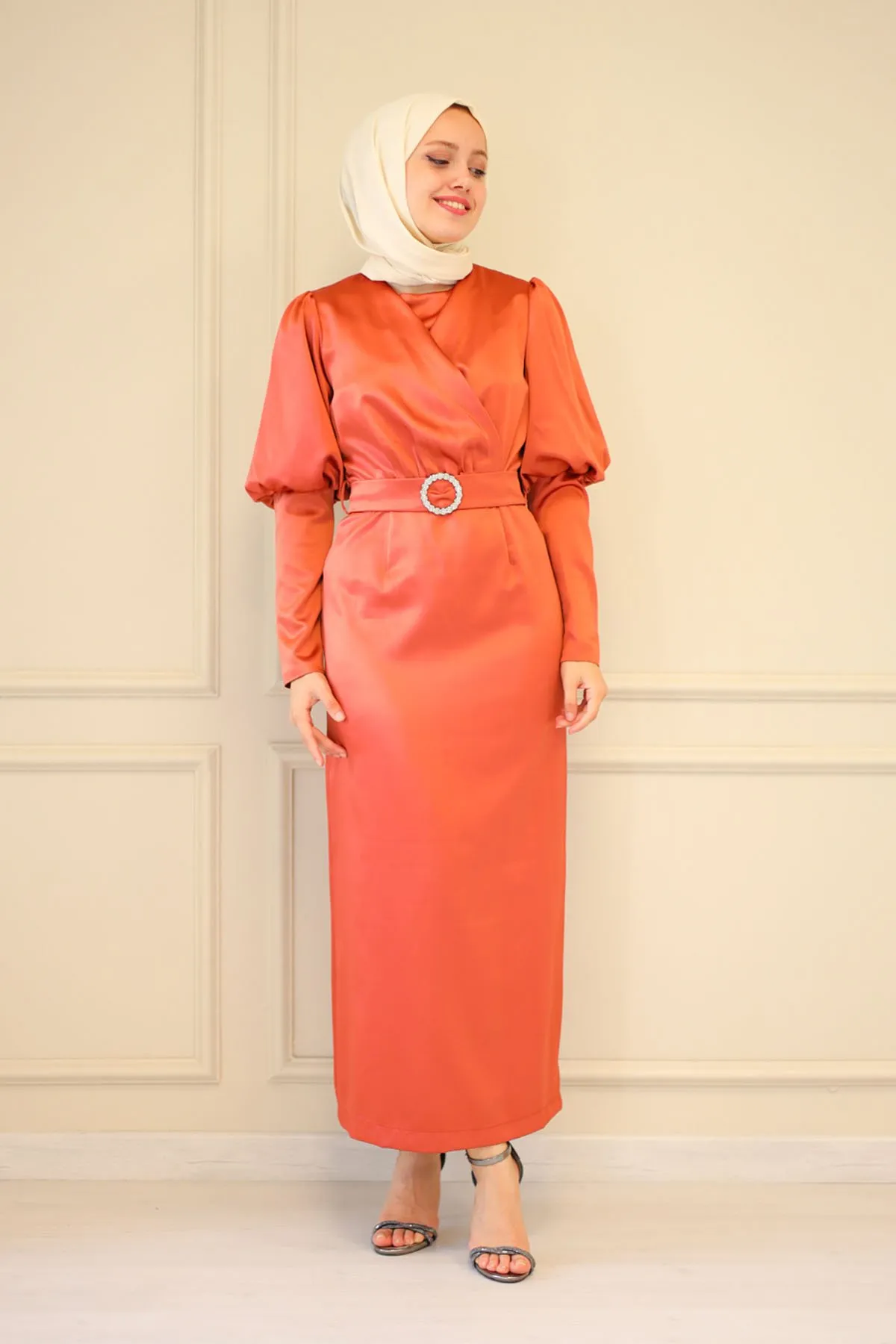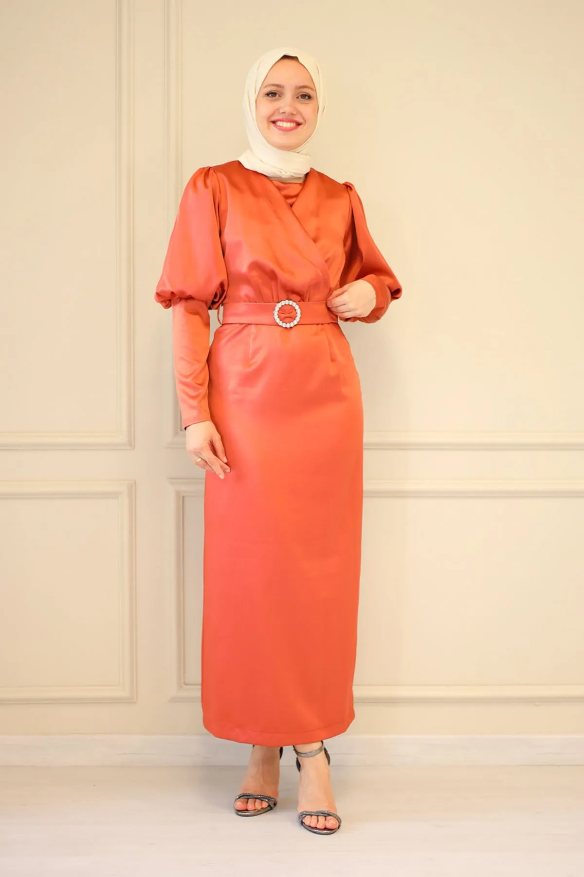 DescriptionReviews Description Satin evening dress with beltMade of satin fabric, it can be used in all seasons.It has a round neck, and has a zipper that can be used at the back.There is no stretch in the fabric.The mold is one size smaller.There may be a difference in product color due to shots.Washing: Dry clean onlyModel dimensions: Height: 170 cm, Chest: 82 cm, Waist: 68 cm, Hips: 84 cm, Weight: 54 kg.(The product is in model size 38)Dress Sizes: 36 - 40 - 42 - 44 Reviews Be the first to review this item There are no reviews yet