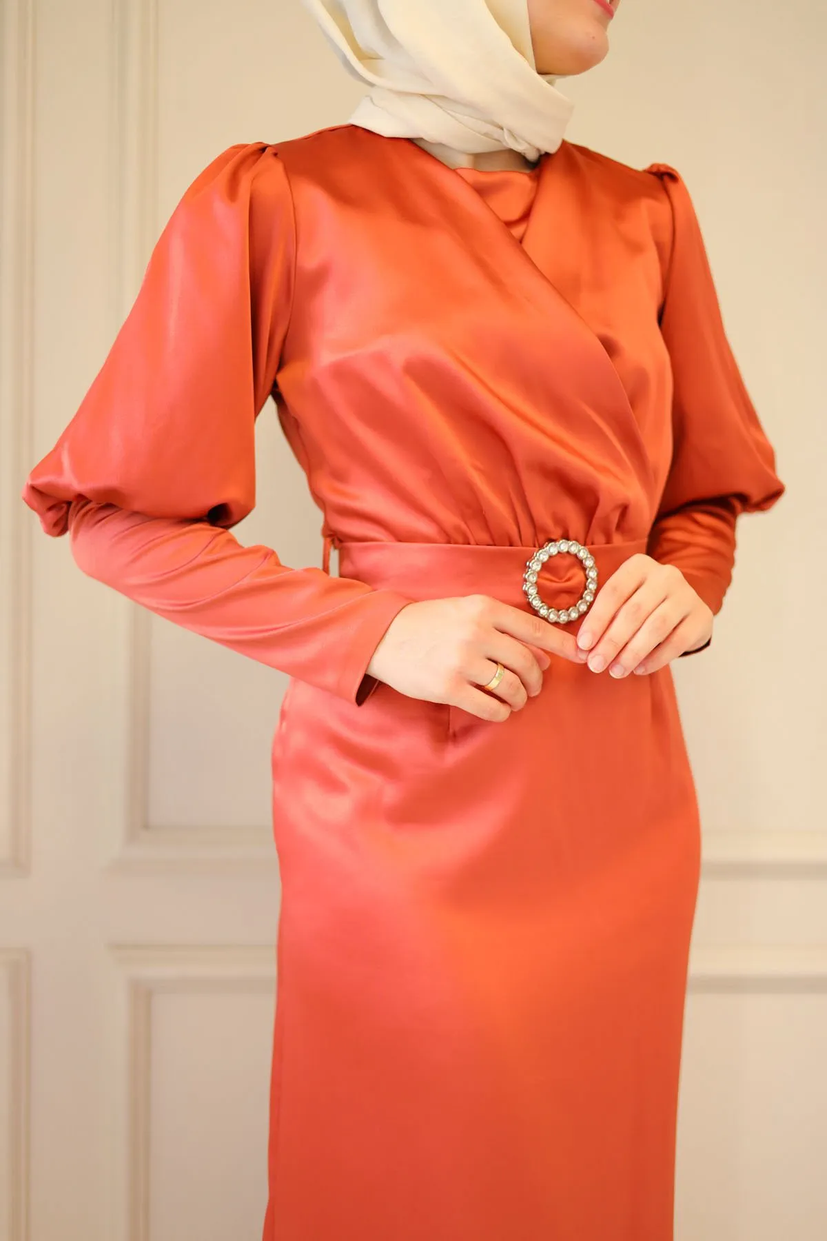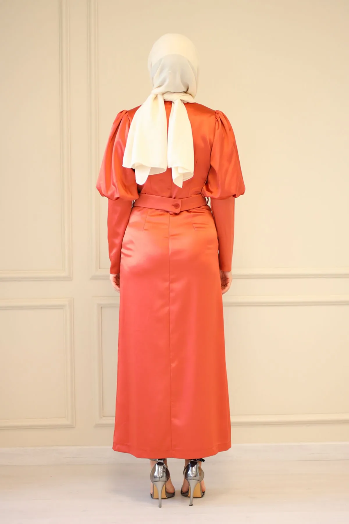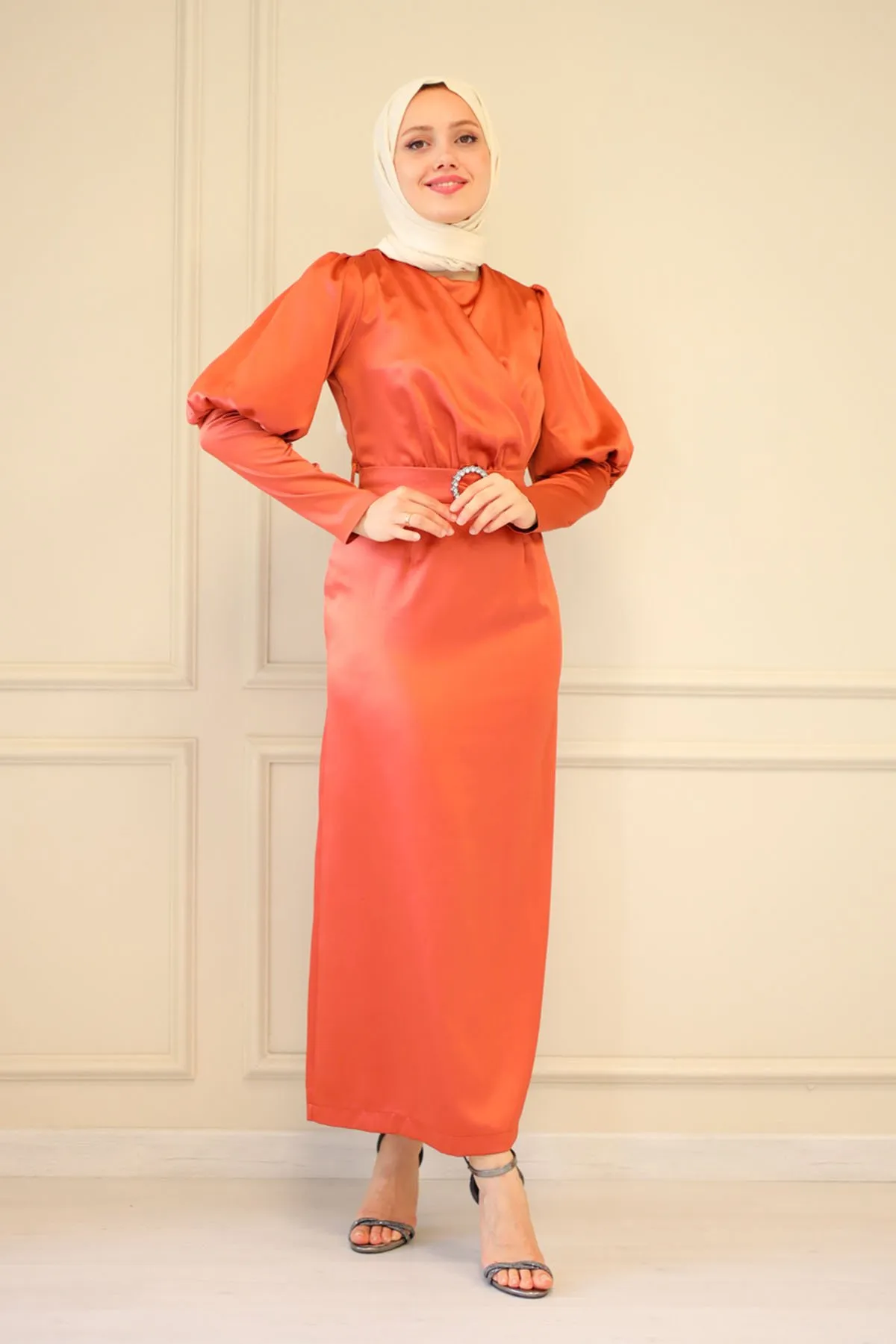 DescriptionReviews Description Satin evening dress with beltMade of satin fabric, it can be used in all seasons.It has a round neck, and has a zipper that can be used at the back.There is no stretch in the fabric.The mold is one size smaller.There may be a difference in product color due to shots.Washing: Dry clean onlyModel dimensions: Height: 170 cm, Chest: 82 cm, Waist: 68 cm, Hips: 84 cm, Weight: 54 kg.(The product is in model size 38)Dress Sizes: 36 - 40 - 42 - 44 Reviews Be the first to review this item There are no reviews yet