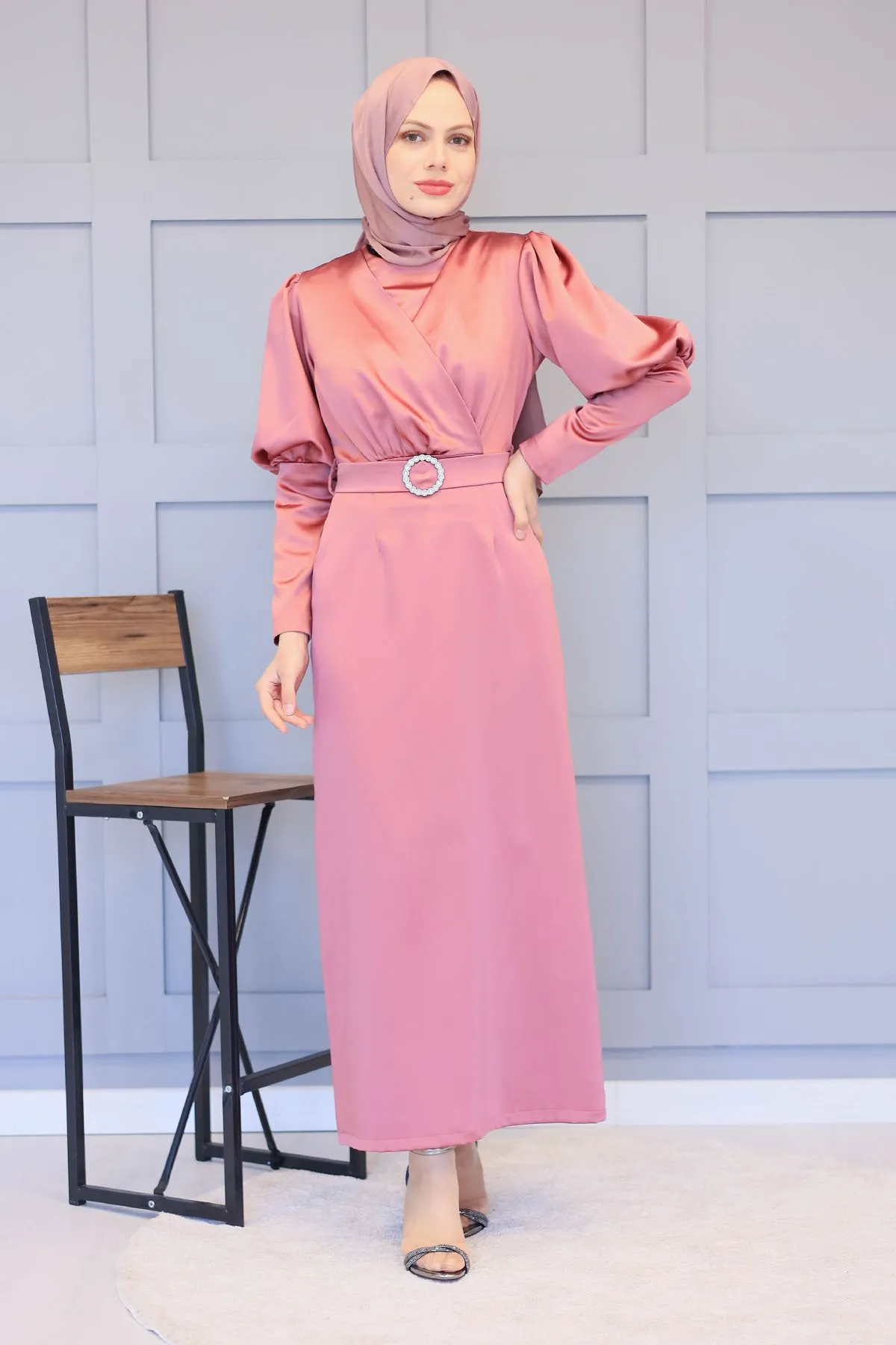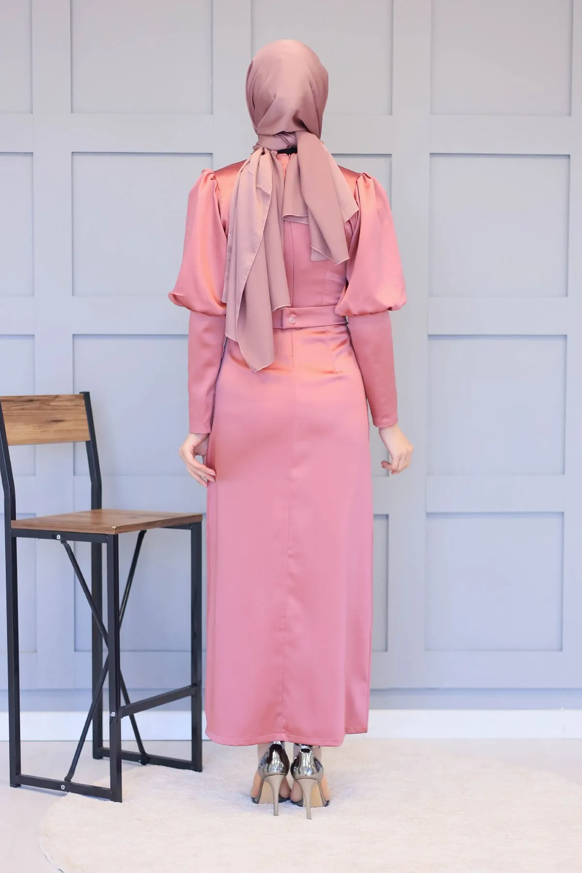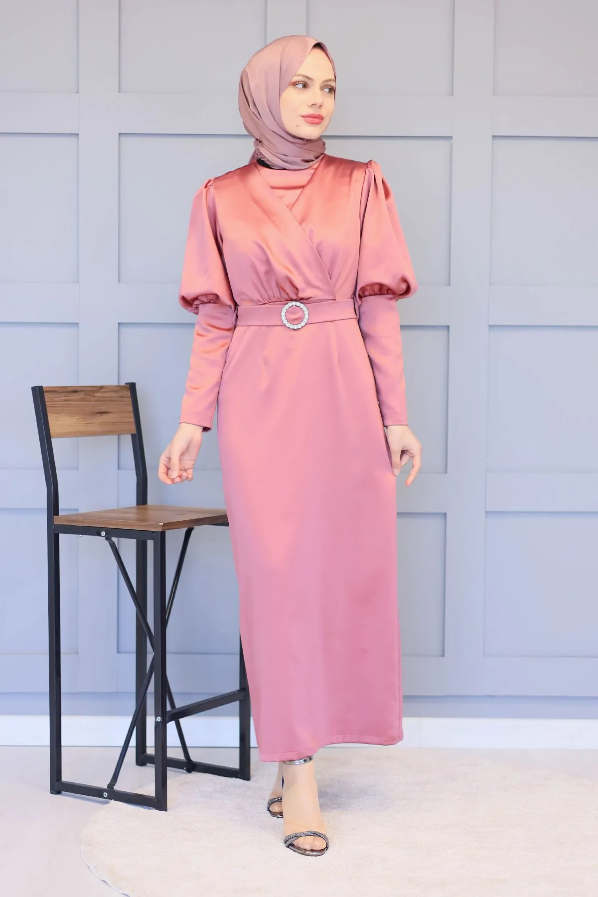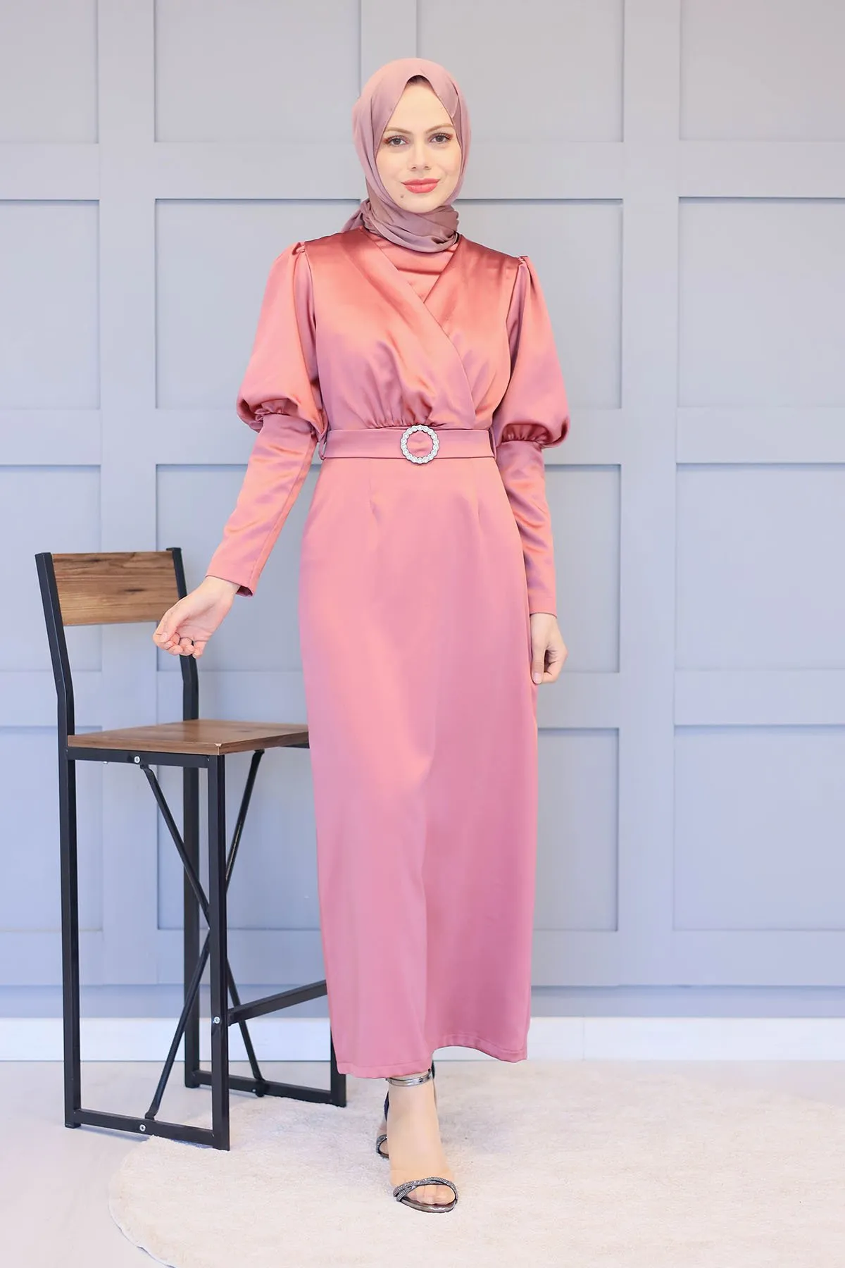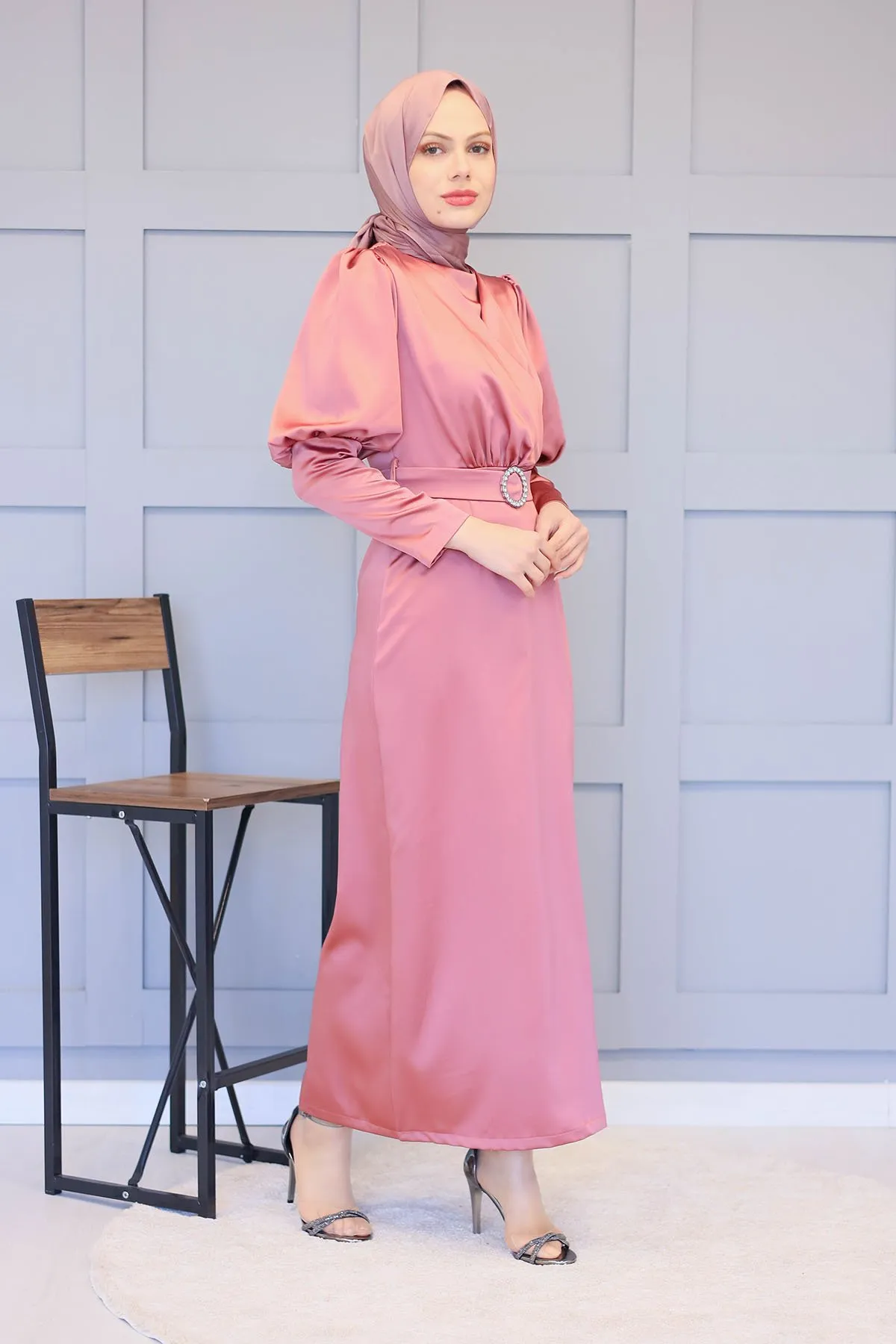 DescriptionReviews Description Satin evening dress with pink satin beltMade of satin fabric, it can be used in all seasons.It is not lined. It does not appear through it.It has a round neck, and has a zipper that can be used at the back.There is no stretch in the fabric.Product runs one size smaller.There may be a difference in product color due to shots.Washing: Dry clean onlyModel dimensions: Height: 170 cm, Chest: 82 cm, Waist: 68 cm, Hips: 84 cm, Weight: 54 kg.(The product is in model size 38)Dress Size: 40 Reviews Be the first to review this item There are no reviews yet