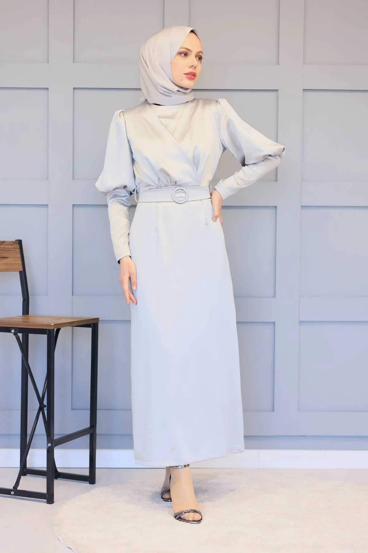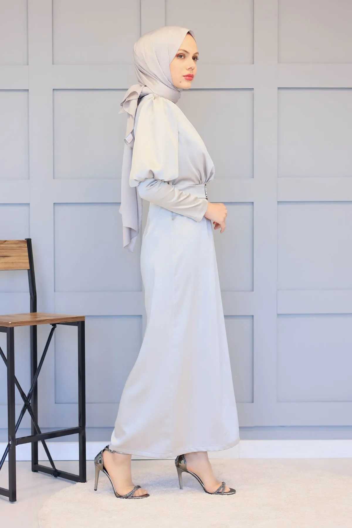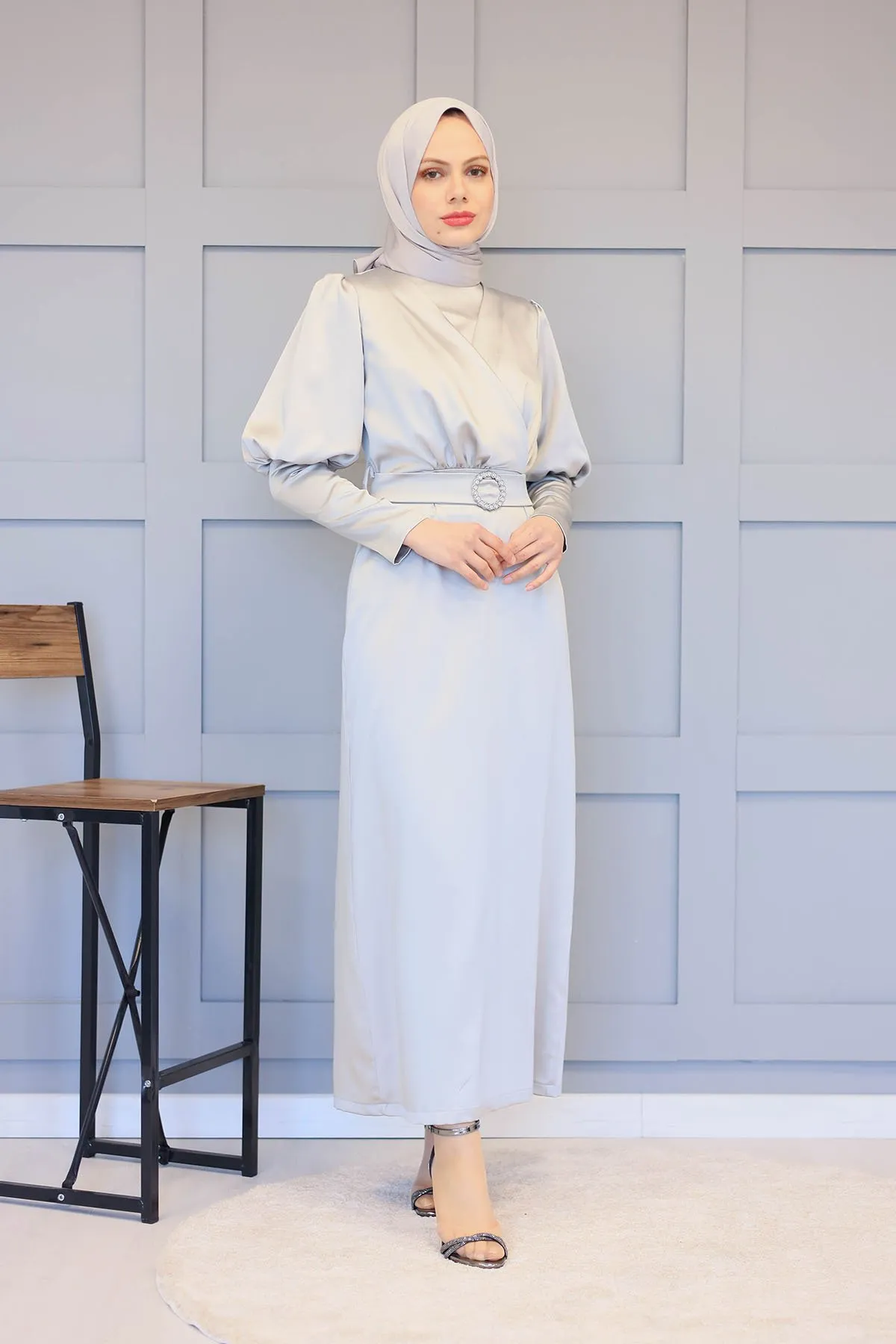 DescriptionReviews Description Gray satin evening dress with belt at the waistMade of satin fabric, it can be used in all seasons.The product is not lined and does not show throughIt has a round neck, and has a zipper that can be used at the back.There is no stretch in the fabric.There may be a difference in product color due to shots.Washing: Dry clean onlyModel dimensions: Height: 170 cm, Chest: 82 cm, Waist: 68 cm, Hips: 84 cm, Weight: 54 kg.(The product is in model size 38)Dress Sizes: 42 - 44 Reviews Be the first to review this item There are no reviews yet