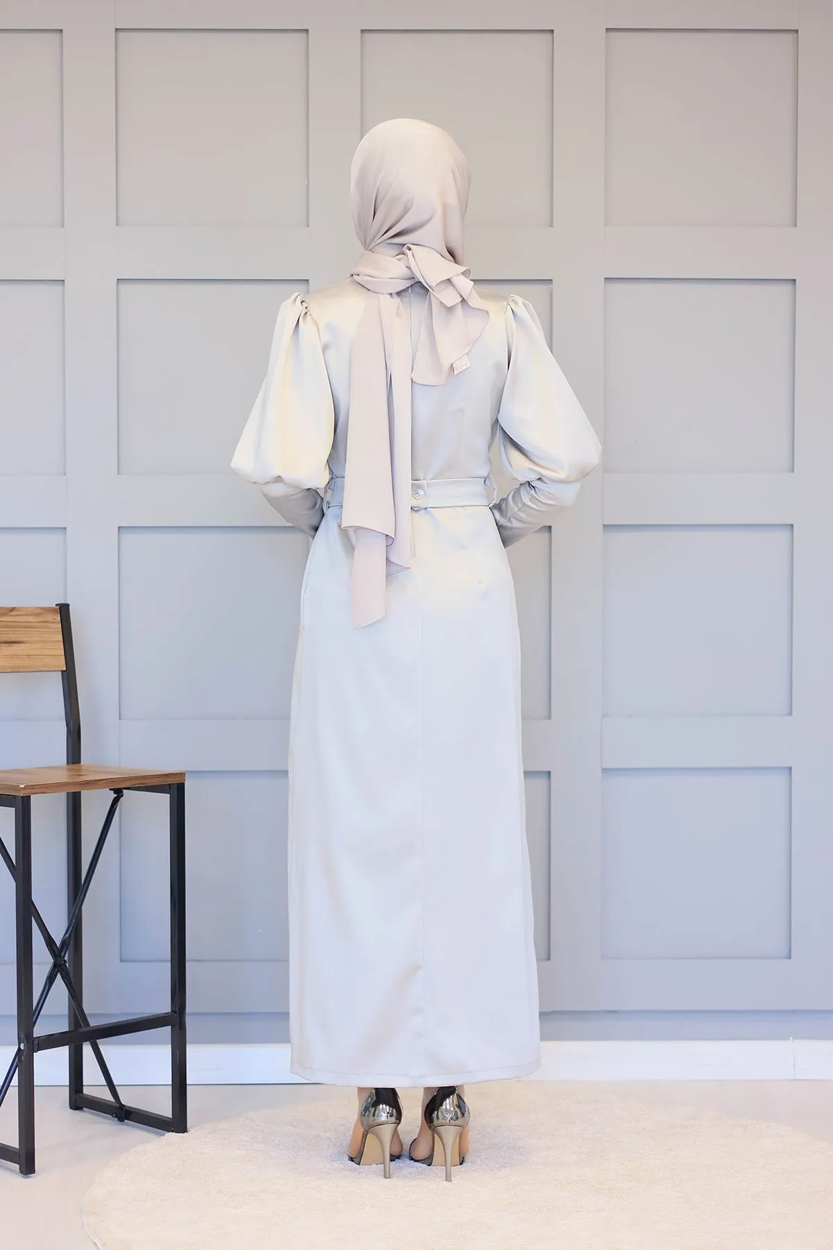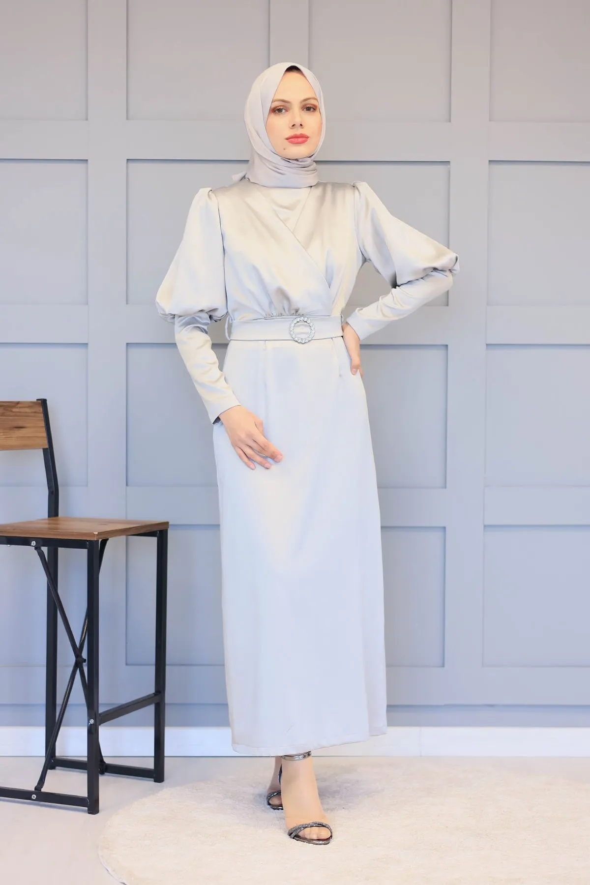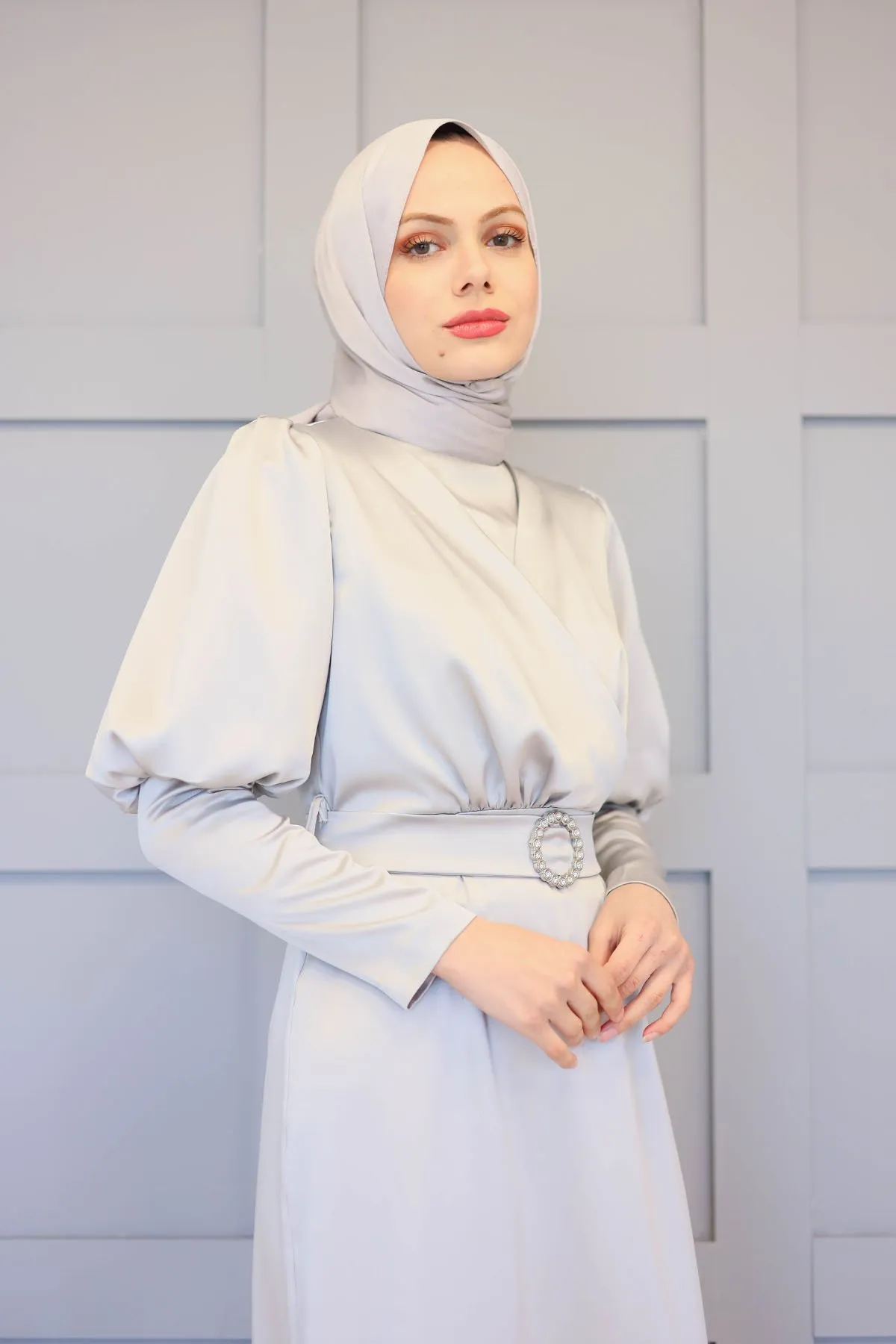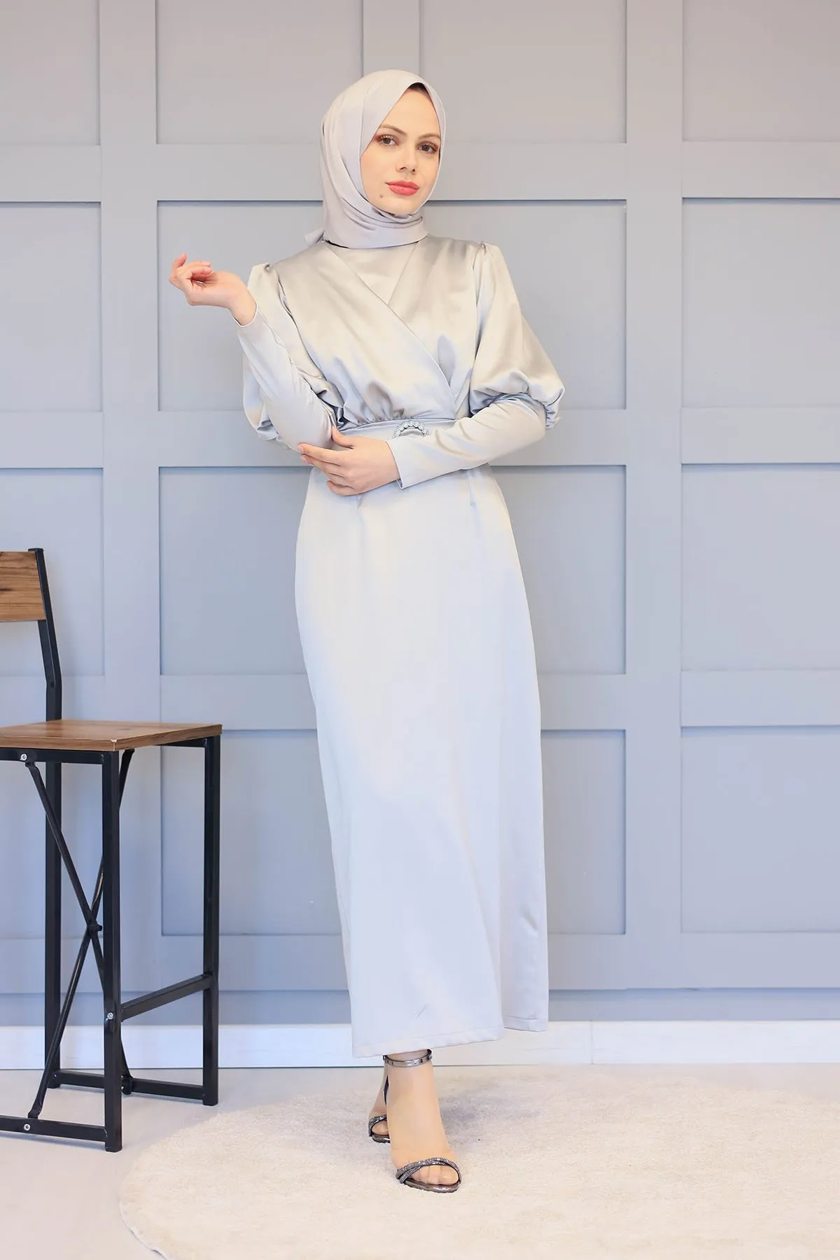 DescriptionReviews Description Gray satin evening dress with belt at the waistMade of satin fabric, it can be used in all seasons.The product is not lined and does not show throughIt has a round neck, and has a zipper that can be used at the back.There is no stretch in the fabric.There may be a difference in product color due to shots.Washing: Dry clean onlyModel dimensions: Height: 170 cm, Chest: 82 cm, Waist: 68 cm, Hips: 84 cm, Weight: 54 kg.(The product is in model size 38)Dress Sizes: 42 - 44 Reviews Be the first to review this item There are no reviews yet