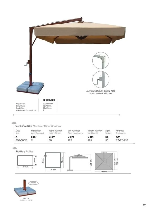 The plastic parts of the skeleton are manufactured using ABS and POLYAMID PA6 PRIME raw materials with a 2-year guarantee against breakage, which are used in the production of awnings all over the world. Since wind clearing of your umbrella can be done with air windows on top, you can use your umbrella safely in inclement weather.