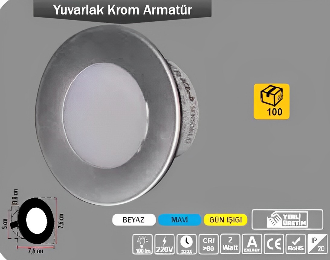 - 2W - MERDİVEN ARMATÜR - YUVARLAK KROM - SIVA ALTI - 220V