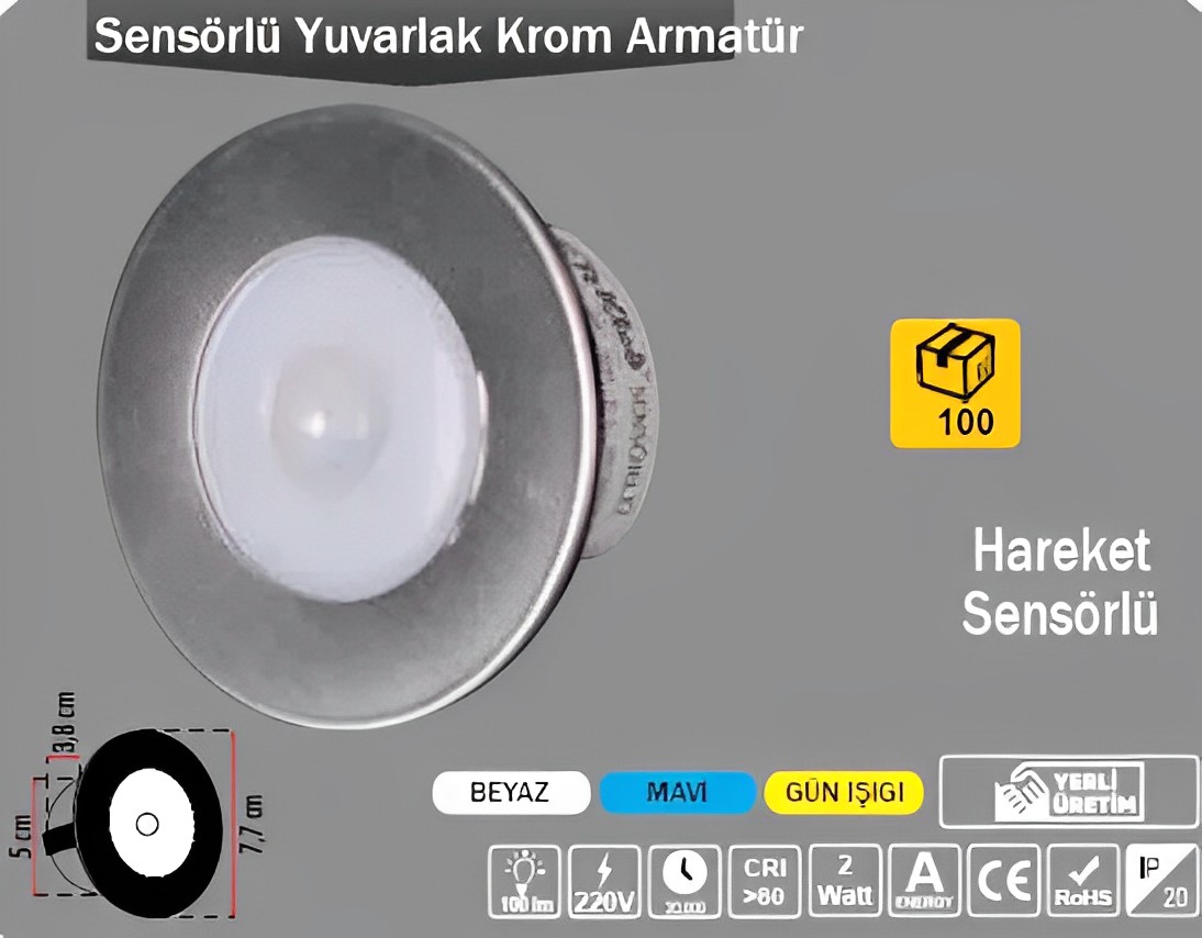- 2W - MERDİVEN ARMATÜR - YUVARLAK KROM - SIVA ALTI - 220V - HAEREKET SENSÖRLÜ