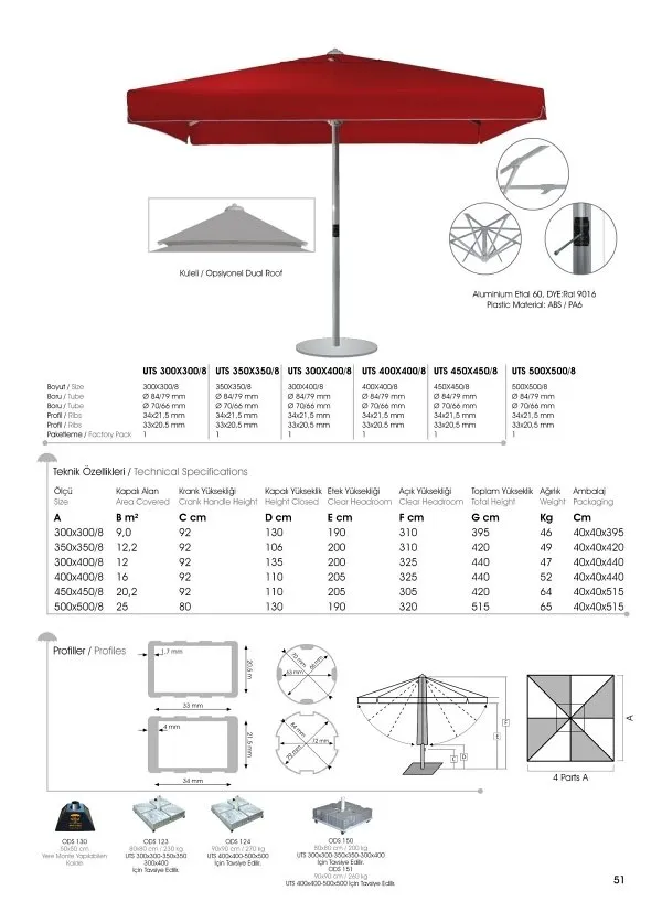 The middle tube of your umbrella, which can be covered with electrostatic paint in white or RAL colors, whose body can be anodized, has a diameter of 84 mm.